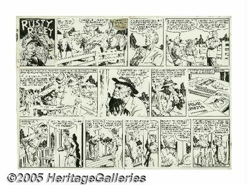 <B>Frank Godwin - Rusty Riley Sunday Comic Strip Original Art, dated 6-3-56 (King Features Syndicate, 1956).</B></I> Buster Bunko is not an ordinary tramp. He's the slickest con man ever to escape from state prison! Spotting some movie magazines on the porch, he makes his play to get some free grub. One of the last great penman, Frank Godwin had forty years experience as an illustrator, painter, and cartoonist when he started work on the <I>Rusty Riley</B></I> strip. His skill at portraying recognizable and realistic characters, animals, and lush outdoor scenes made <I>Rusty Riley</B></I> one of the most beautiful comic strips ever produced. This strip, dated 6-3-56, is a great example of his skill as an cartoonist. The image area measures 23" x 16.5," with some light editorial markings in blue pencil, and a slightly aged word balloon replacement in the first panel, otherwise image area. The work is clean, with some slight signs of aging overall, but the page is a beaut nonetheless.