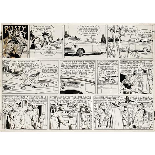 <B>Frank Godwin - Rusty Riley Sunday Comic Strip Original Art, dated 4-24-55 (King Features, 1955).</B></I> Starting in 1948, King Features distributed <I>Rusty Riley</B></I>, the story of an orphaned runaway boy, his dog, and the wealthy patron who befriended him. The strip's artist, Frank Godwin, was one of the last survivors of that turn-of-the-century breed of artists who could perform miracles with ink drawing. This Sunday is a fine example of Godwin's skill as a cartoonist. The strip has an approximate image area of 23" x 16". Aside from some staining in the title logo stat, the art is in Very Good condition.<BR><BR><b>Shipping:</b> Large Flat (<a target="_blank" href="http://www.heritageauctions.com/common/shipping.php">view shipping information</a>)