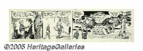 <B>Frank Godwin - Rusty Ryan Daily Comic Strip Original Art (undated).</B></I> Frank Goodwin's mastery with a pen is evident in this handsome daily. An experimental vertical take-off and landing airplane is the highlight of this continuity. The strip is undated and numbered A-11. This early <I>Rusty Ryan</B></I> strip was a "prototype" version of Godwin's later strip, <I>Rusty Riley</B></I>. The image area of the strip measures 27.5" x 6.5", and the art is in Excellent condition. You can't top Frank Godwin for detailed pen work!