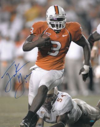 In 28 total games with the Miami Hurricanes, Frank Gore rushed 380 times for 1,975 yards and seventeen touchdowns. His 1,975 yards rank seventh on the school's career-record list and his seventeen scores are tied for tenth. He also caught 23 passes for 225 yards (9.8 avg), returned two kickoffs for 48 yards and recorded five tackles on special teams. Frank Gore has hand autographed this Miami Hurricanes 16x20 Photo. Gore Hologram and Certificate of Authenticity from Athlon Sports.