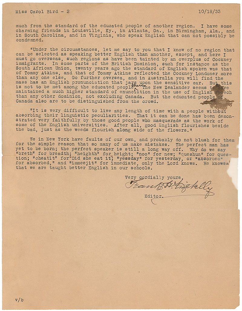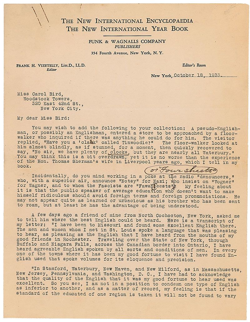 Lexicographer, etymologist, and editor (1864–1938) who worked for Funk & Wagnalls. TLS, two pages, 8.5 x 11, The New Internation Encyclopaedia & Year Book letterhead, October 18, 1933. Letter to Carol Bird discussing variations of spoken English in response to a question of “where the best English could be heard.” In part: “I know of no region that can be selected as speaking better English than another, except, and here I must go overseas, such regions as have been tainted by an overplus of Cockney immigrants….It is very difficult to live any length of time with a people without absorbing their linguistic peculiarities. That it can be done has been demonstrated very faithfully by those good people who masquerade as the work of some of the English universities. After all, good English flourishes beside the bad, just as the weeds flourish along side of the flowers. We in New York have faults of our own, and probably do not blush for them for the simple reason that so many of us make mistakes. The perfect man has yet to be born; the perfect speaker is still a long way off.” In very good condition, with small edge separations at mailing folds, tape-repaired paper loss to the right edge of the second page, a rusty paperclip mark to the upper left, and some stray ink blots.