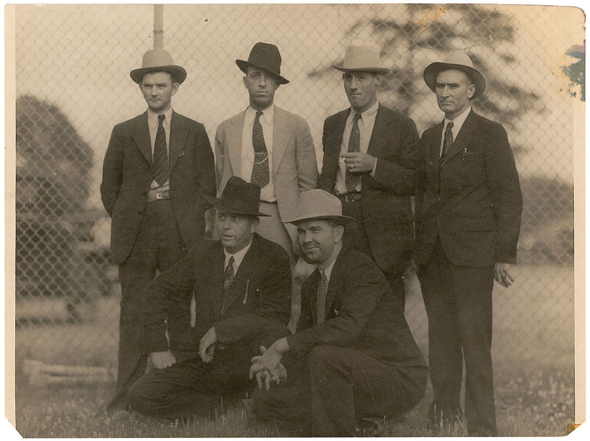 Original vintage first generation 10 x 7.5 semi-glossy photo of Frank Hamer and his posse that tracked down and killed Bonnie and Clyde. Pictured are: Ted Hinton, Prentiss Oakley, B.M. ‘Maney’ Gault, Bob Alcorn, Henderson Jordan, and Hamer. In fine condition, with two clipped corner tips and slightly trimmed horizontal edges.