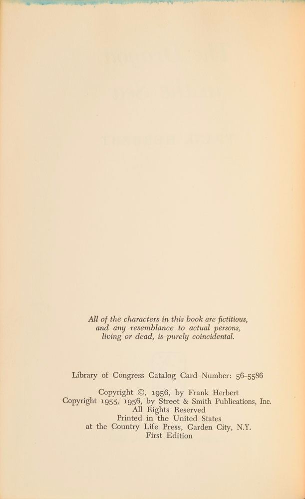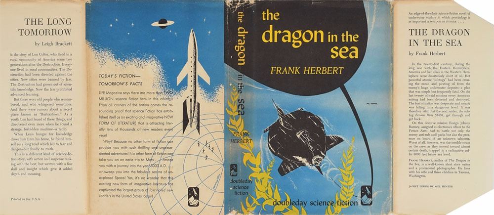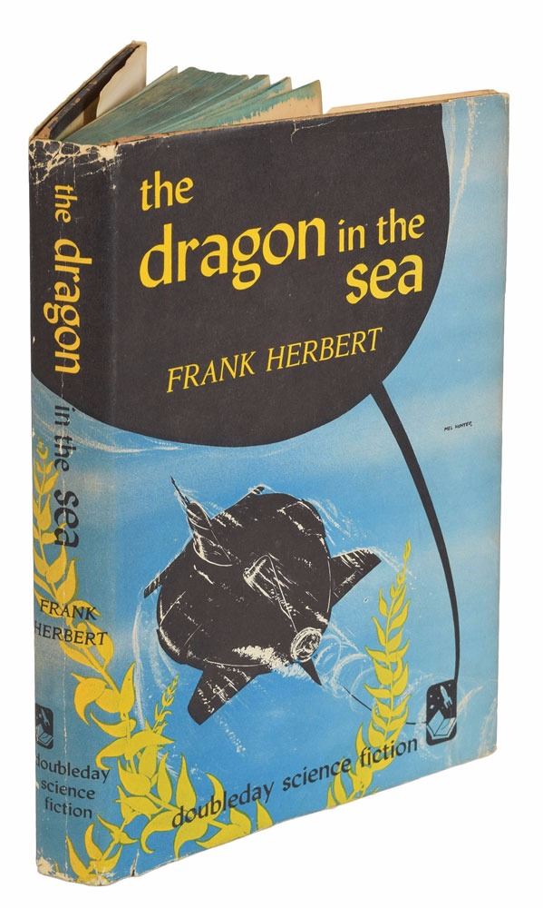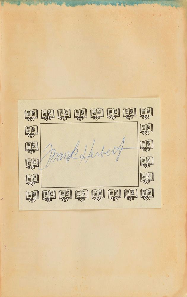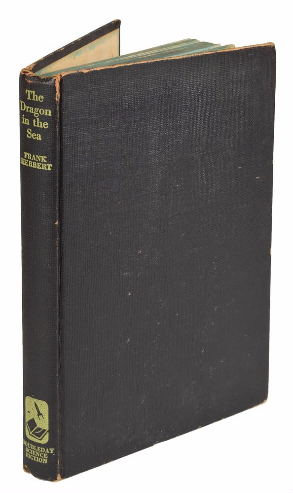 Signed book: The Dragon in the Sea. First edition. Garden City, NY: Doubleday, 1956. Hardcover with dust jacket, 5.75 x 8.5, 192 pages. Signed on a loosely laid-in bookplate in blue ballpoint by Herbert. Autographic condition: fine. Book condition: VG/VG, with edgewear, bleeding topstain, a few nicks to spine, and clipped corners to the dust jacket.