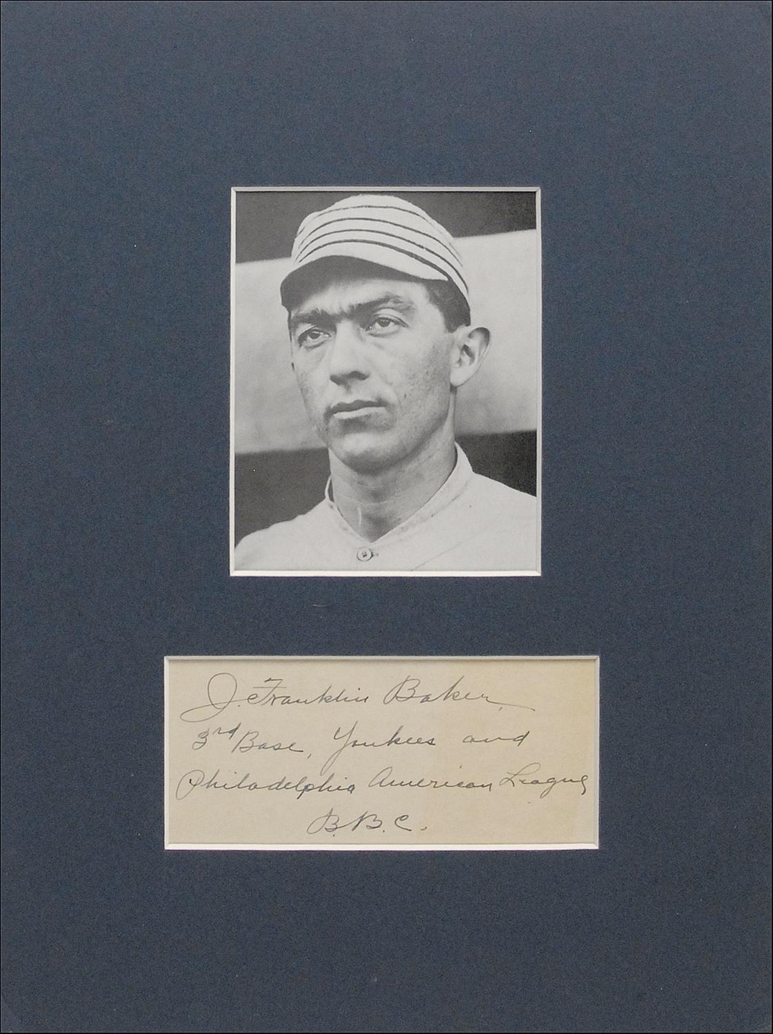 Baseball Hall of Famer (1886–1963) considered one of the premier power hitters during the Dead-Ball era. Vintage fountain pen signature, “J. Franklin Baker, 3rd Base, Yankees and Philadelphia American League B.B.C.,” on an off-white card. Matted with a small photo of Baker to an overall size of 9 x 12. Block of toning affecting last few letters of signature and a few other words, otherwise fine condition.
