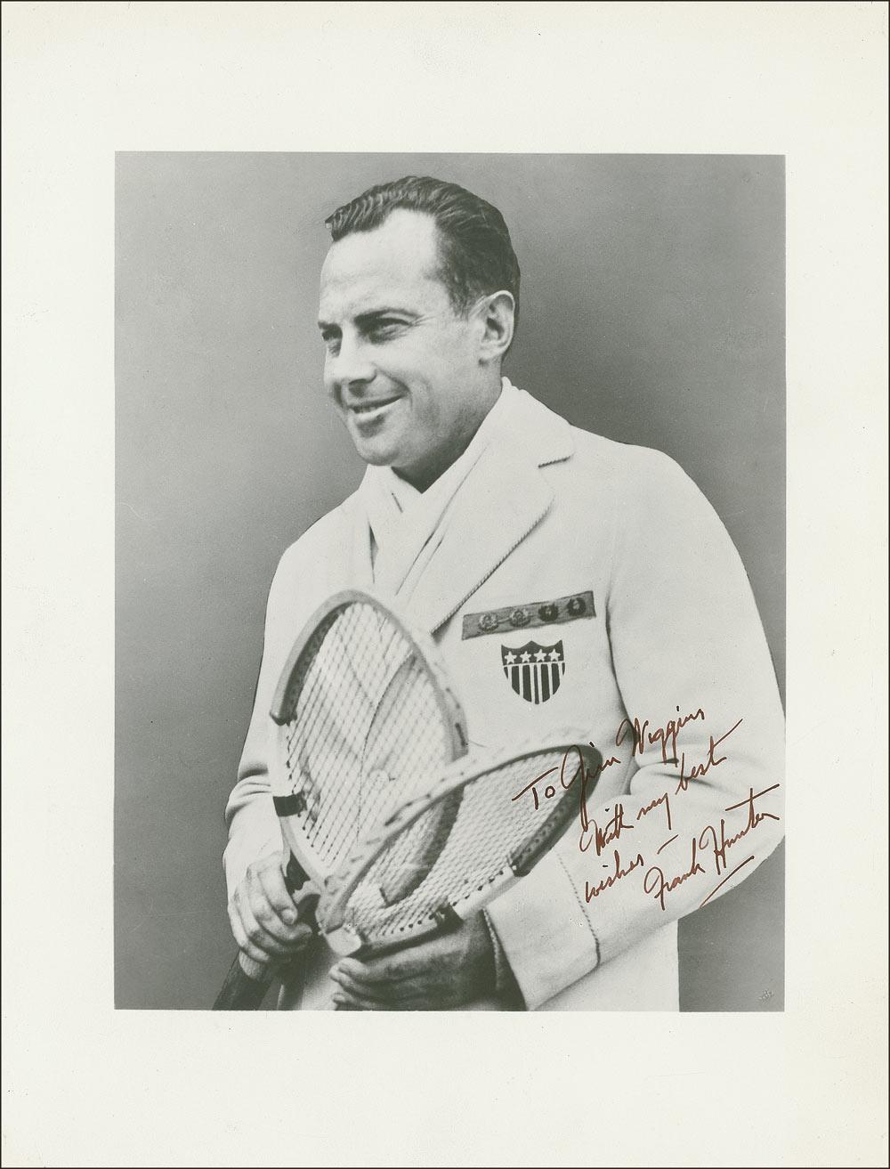 International Tennis Hall of Famer (1894-1981), who won a gold medal at the 1924 Olympics, and was a two-time doubles champion at Wimbledon. Vintage 7.75 x 10 photo, signed and inscribed in fountain pen “To Jim Wiggins, With my best wishes—Frank Hunter.” In fine condition.