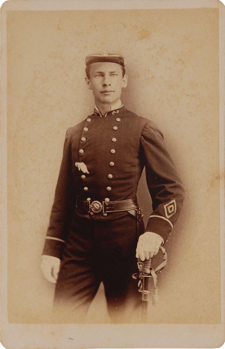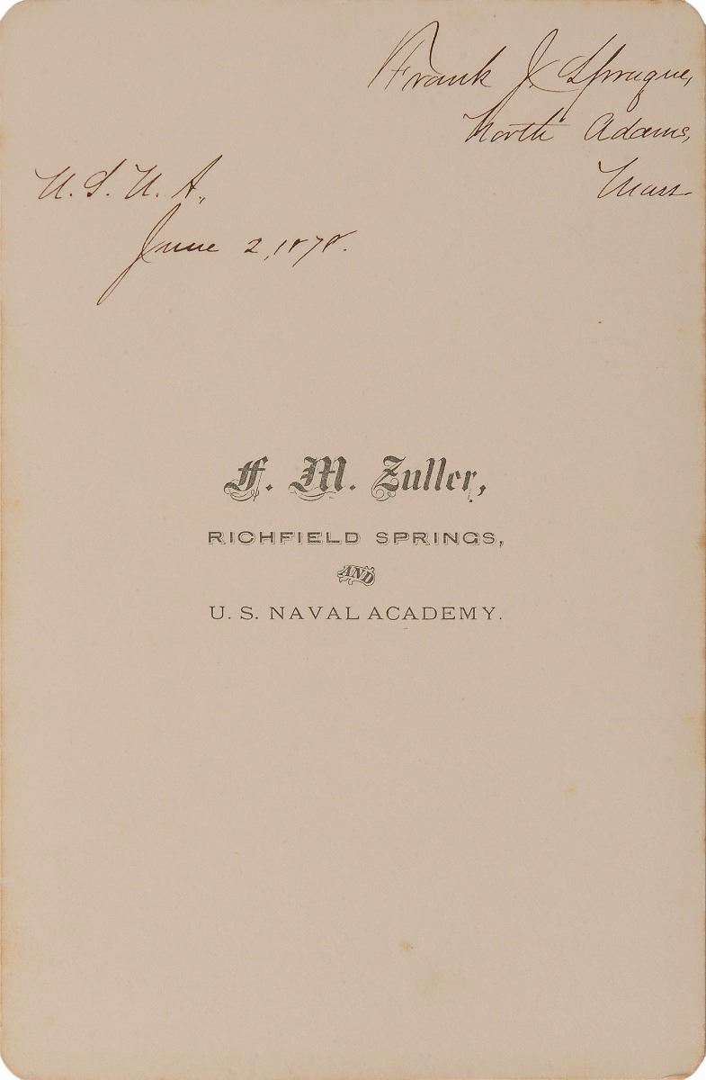 Naval officer and inventor (1857–1934) who contributed to the development of the electric motor, electric railways, and electric elevators. Sharp 4.25 x 6.5 cabinet photo of Sprague in his military uniform, signed on the reverse in crisp black ink, “Frank J. Sprague, North Adams, Mass., U. of U. A., June 2, 1878.” Published by F. M. Zuller, Richfield Springs, US Naval Academy. 4.25 x 6.5 signed photograph. In fine condition, with some light foxing to the image.