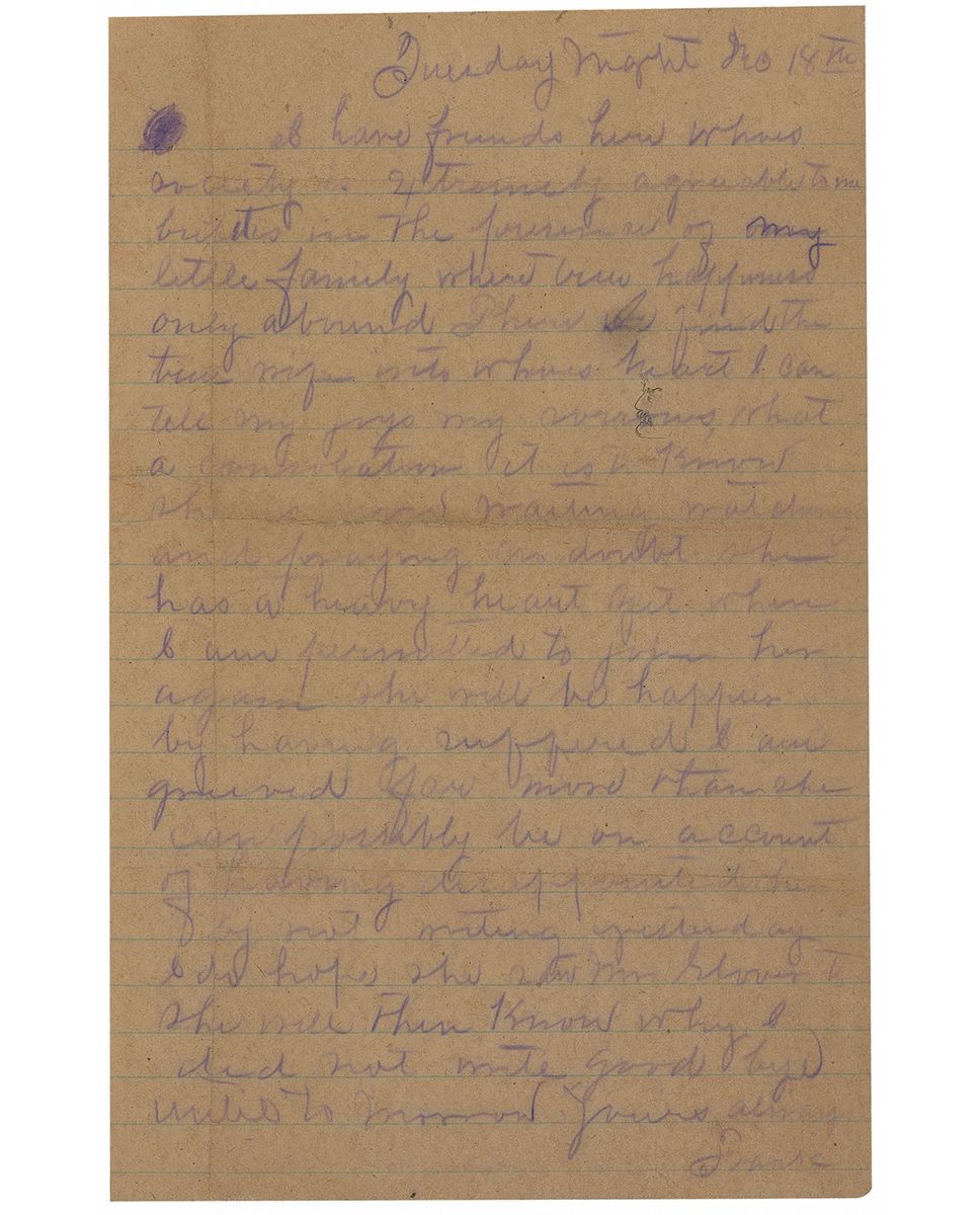 ALS signed “Frank,” one page, lightly-lined, 5.5 x 8.75, December 18, [1883]. Letter to his wife, written while awaiting trial on murder and armed robbery charges. In full: “I have friends here whose society is extremely agreeable to me but it is in the presence of my little family where true happiness only abound. There I can find the true wife into whose heart I can tell my joys my sorrows, what a consolation it is to know she is waiting watching and praying no doubt she has a heavy heart. I am grieved far more than she can possibly be on account of having disappointed her by not writing yesterday. I do hope she saw Mr. Slover so she will then know why I did not write.” The fragile paper has been professionally backed for preservation and encapsulated in a Mylar sleeve. In very good condition, with moderate to heavy uniform toning and a few creases. In September of 1882—five months after his brother Jesse was gunned down by fellow gang member Robert Ford—James turned himself in to Missouri governor Thomas Crittenden in Jefferson City, tired of running and hoping to avoid the same gruesome fate. He was held and put on trial in Gallatin, Missouri, for participating in two murders during a train robbery. However, having reached folk-hero status within the general population, he was acquitted by the jury. James was then charged and acquitted again in Alabama, and finally told that he would not be extradited to any other state if he kept a low profile. A remarkable letter written in the anguish of an uncertain fate.