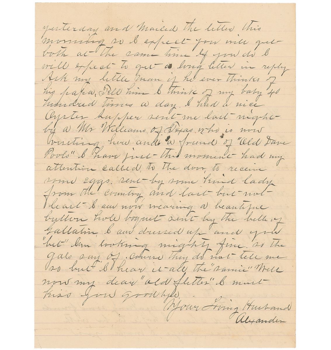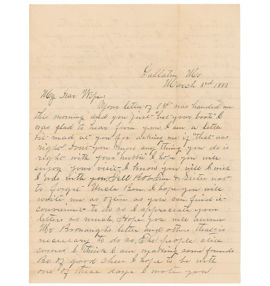 ALS signed with his true first name, “Alexander,” one page, 8 x 10.5, March 3, 1883. Letter written to his wife while jailed in Gallatin, Missouri, a month after his first legal victory as he awaited further charges. In part: “You just ‘bet your boots’ I was glad to hear from you. I am a little bit mad at you for asking me if ‘that was right.’ Don’t you know any thing you do is right with your ‘hubbie.’ I hope you will enjoy your visit I know you will I wish I was with you…The people still comes. I think I am making some friends. Be of good cheer I hope to be with one of these days. I wrote you yesterday and mailed the letter this morning so I expect you will get both at the same time. If you do I will expect to get a long letter in reply. Ask my little man if he ever thinks of his papa. Tell him I think of my baby 40 hundred times a day. I had a nice Oyster supper sent me last night by a Mr. Williams of Texas who is now visiting here and a friend of ‘Old Dave Pools.’ I have just this moment had my attention called to the door, to receive some eggs sent by some kind lady from the country, and last but not least I am now wearing a beautiful button hole boquet [sic] sent by the belle of Gallatin I am dressed up and you ‘bet’ I am looking mighty fine, so the gals say. Of course they do not tell me so but I hear it all the ‘samie.’ Well now my dear ‘old flitter’ I must kiss you good bye.” In fine condition, with intersecting folds.