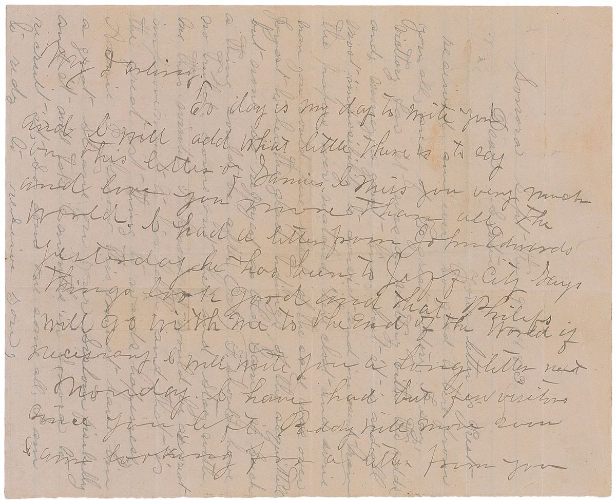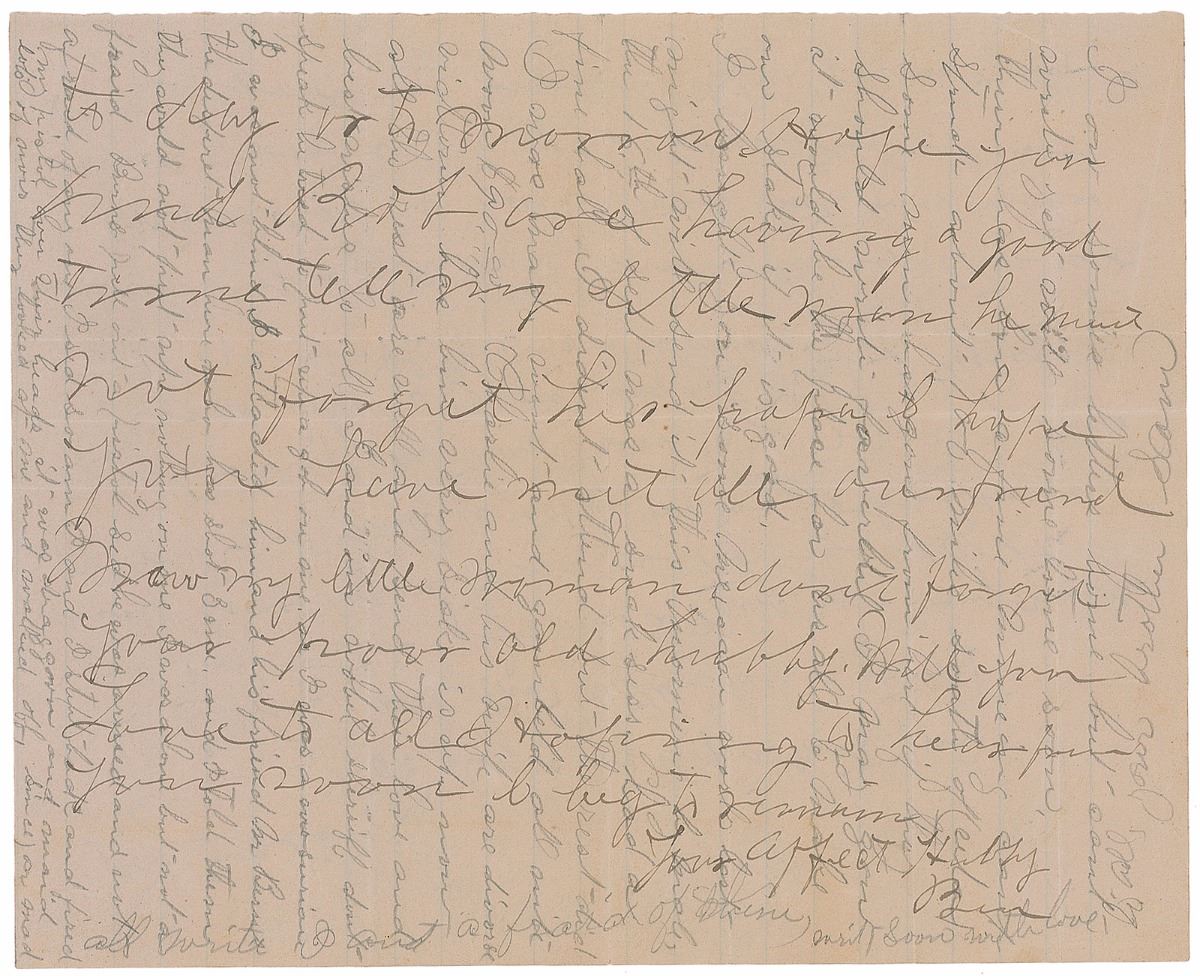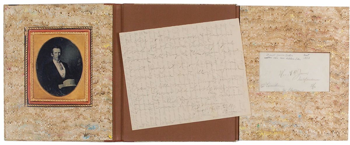 Outlaw and older brother of Jesse James (1843–1915) who at times went by the alias ‘Ben J. Woodson.’ Rare ALS signed “Your affect Hubby, Ben,” written horizontally in dark ink over a penciled letter of his brother-in-law, Sam Ralston, dated September 19, 1883, from Sonora, Mexico, one page both sides, 9.75 x 8. Letter to his wife, written while awaiting trial for murder. In full: “Today is my day to write you and I will add what little there is to say in this letter of Sammie’s. I miss you very much and love you more than all the world. I had a letter from John Edwards yesterday. He has been to Jeff City says things look good and that Philips will go with me to the end of the world if necessary. I will write you a long letter next Monday. I have had but few visitors since you left. Paddy will move soon. I am looking for a letter from you today or tomorrow. Hope you and Rob are having a good time tell my little man he must not forget his papa. I hope you have met all our friends. Now my little woman don't forget your poor old hubby will you. Love to all & hoping to hear from you soon.” Includes the original mailing envelope, addressed in James’s hand, “Mrs. A. F. James, Independence, Mo.,” with a collector’s notation along the top which reads, “Frank James letter written over Sam Ralston letter Sept. 1883.” Letter, envelope, and a portrait of James housed in a handsome slipcase of marbled board with a leather spine. In fine condition, with intersecting mailing folds, a bit of expected light contrast to text, and some scattered light toning.