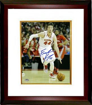 Ahead of the 2014 season Frank Kaminsky was named the Big Ten preseason player of the year. The Badgers were unanimously picked to win the Big Ten Championship. The Badgers ended up winning both the Big Ten regular season and the Big Ten tournament.Kaminsky was named consensus first-team All-American. On March 31, 2015 he was named the National Association of Basketball Coaches Player of the Year. On April 3 he was named Associated Press College Basketball Player of the Year, the first Wisconsin player to receive the award. He also received the Oscar Robertson Trophy as the United States Basketball Writers Association College Player of the Year. On April 5, he was named the Naismith College Player of the Year. On April 10, he won both the John R. Wooden Award and Kareem Abdul-Jabbar Center of the Year award. Frank Kaminsky has hand signed this Wisconsin Badgers 16x20 Photo. Schwartz Sports Hologram and Certificate of Authenticity from Athlon Sports. Custom White Mat and Premium Mahogany Frame as shown.