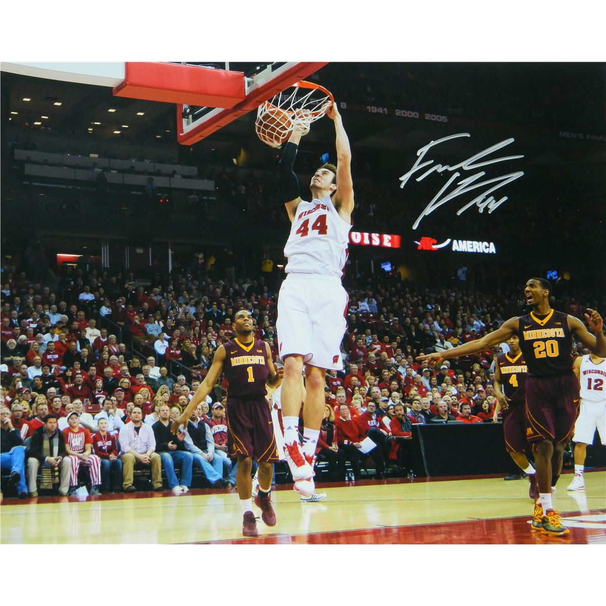 Frank Kaminsky signed Wisconsin Badgers two hand slam dunk action 16x20 photo. Item comes with a Schwartz Sports Memorabilia tamper-proof numbered hologram and Certificate of Authenticity which can be verified online.
