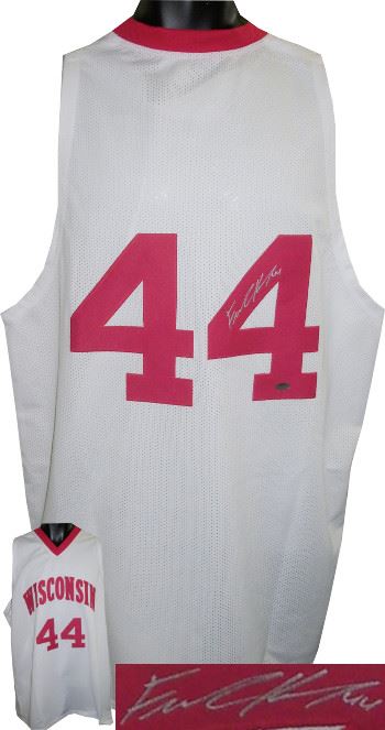 Ahead of the 2014 season Frank Kaminsky was named the Big Ten preseason player of the year. The Badgers were unanimously picked to win the Big Ten Championship. The Badgers ended up winning both the Big Ten regular season and the Big Ten tournament.Kaminsky was named consensus first-team All-American. On March 31, 2015 he was named the National Association of Basketball Coaches Player of the Year. On April 3 he was named Associated Press College Basketball Player of the Year, the first Wisconsin player to receive the award. He also received the Oscar Robertson Trophy as the United States Basketball Writers Association College Player of the Year. On April 5, he was named the Naismith College Player of the Year. On April 10, he won both the John R. Wooden Award and Kareem Abdul-Jabbar Center of the Year award. Frank Kaminsky has hand autographed this unlicensed custom-prostyle White jersey with twill stitched nameplate and numbers. Schwartz Sports Hologram and Certificate of Authenticity from Athlon Sports.