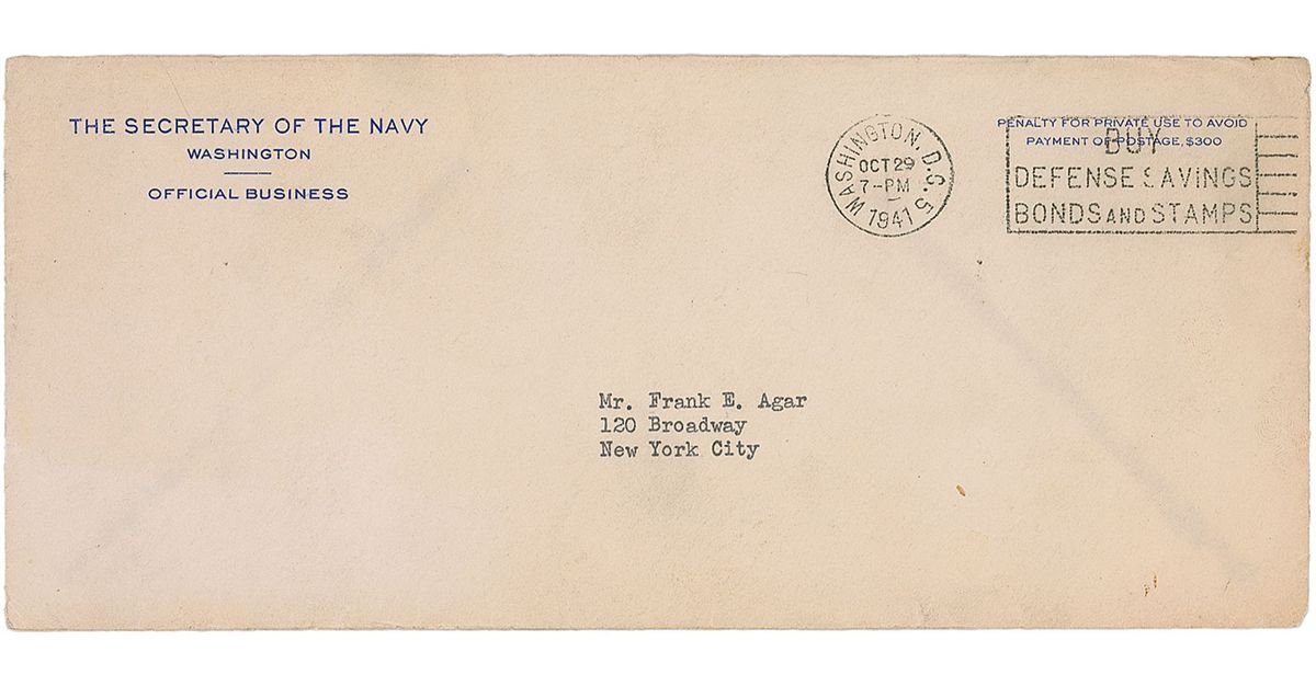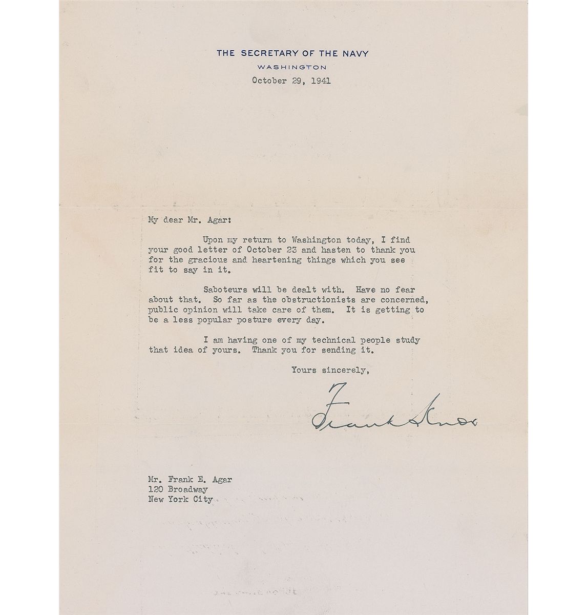 Newspaper editor, publisher, and politician (1874–1944) who served as secretary of the Navy in FDR’s cabinet throughout World War II. TLS, one page, 8 x 10.5, Secretary of the Navy letterhead, October 22, 1941. Letter to Frank E. Agar. In part: “Saboteurs will be dealt with. Have no fear about that. So far as the obstructionists are concerned, public opinion will take care of them. It is getting to be a less popular posture every day. I am having one of my technical people study that idea of yours.” In fine condition. Accompanied by the original mailing envelope.