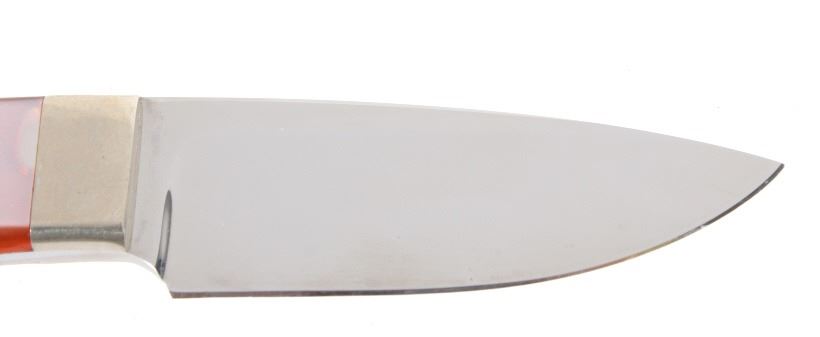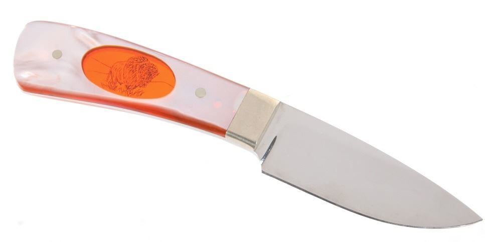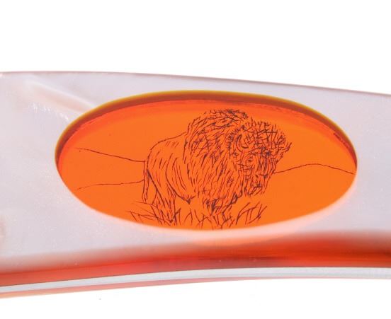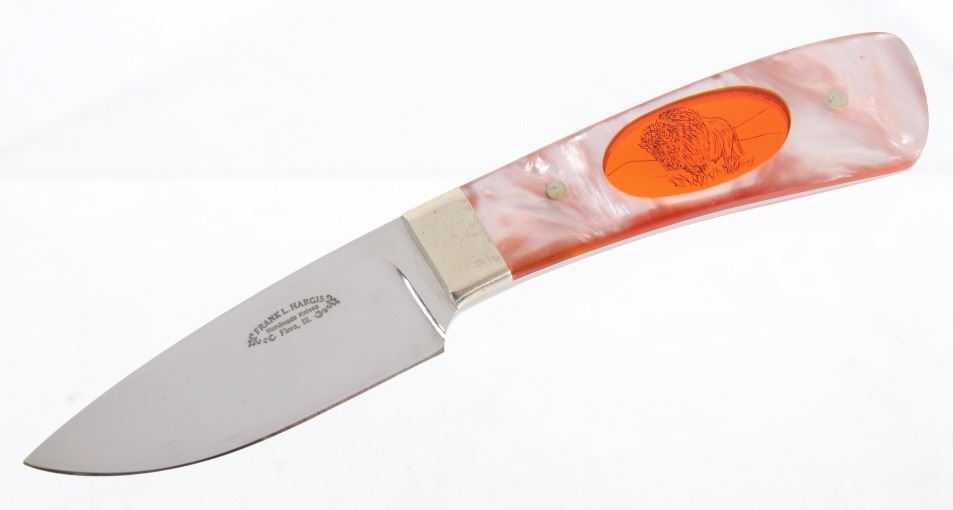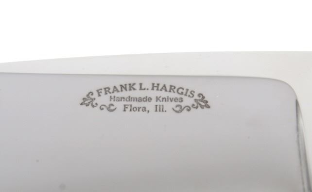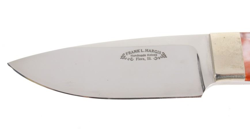 Offered in this lot we have a custom Frank L. Hargis hand crafted hand etched resin handle knife. Frank L. Hargis is a maker of high quality hand crafted knives and is based out of Flora, Illinois and was a member of the Knifemaker's Guild. The knife shows a wonderful mirror finished steel drop point blade with full tang construction. The knife features a steel guard with a red and white resin grip. The grip shows a red resin oval at the center with the etched image of a buffalo. The blade is marked "Frank L. Hargis Handmade Knives Flora, Illinois" with some decorative etchings giving it a medallion look. The knife shows very good condition overall with little to no wear. The knife measures 6 1/2" long overall with a 3" blade.