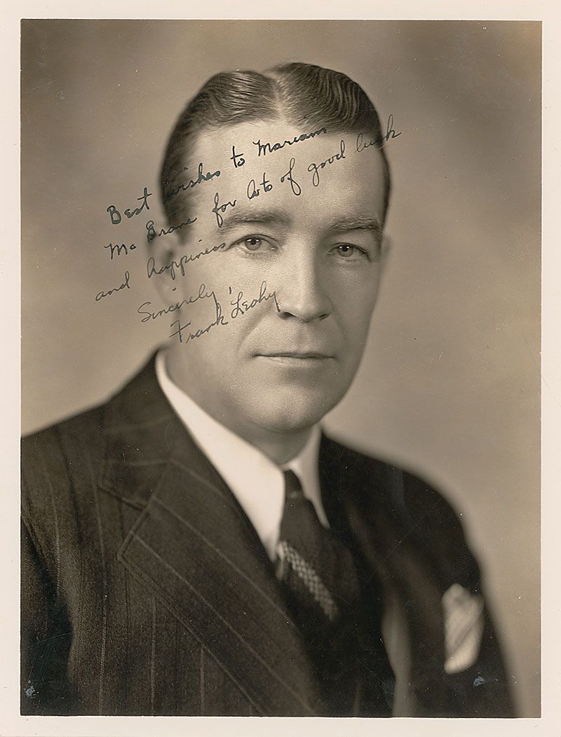 Renowned college football coach (1908–1973) who, after serving as an assistant at Georgetown, Michigan State, and Fordham, became head coach at Boston College. In 1941, he became head coach and athletic director at Notre Dame, his alma mater. Outstanding vintage glossy 7 x 9.25 portrait of Leahy, signed and inscribed across his face in fountain pen, “Best wishes to Mariam McGrane for lots of good luck and happiness, Sincerely, Frank Leahy.” In fine condition, with some surface impressions to the lower right.