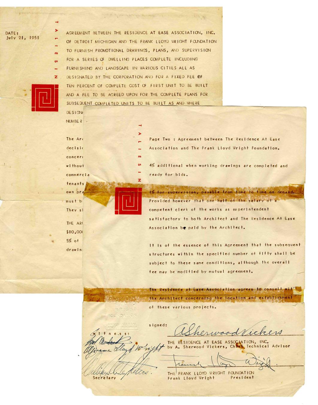 Frank Lloyd Wright contract signed, dated 21 July 1951 on ''Taliesin'' stationery, Wright's famed summer residence near Spring Green, Wisconsin. Two-page agreement between the ''Residence at Ease Association of Detroit Michigan'' and the Frank Lloyd Wright Foundation obliges Wright ''…to furnish promotional drawings, plans, and supervision for a series of dwelling places…'' Contract, measuring 8.5'' x 11'', includes a rare seal on second page reading, ''The Frank Lloyd Wright Foundation / Corporate Seal / State of Wisconsin''. Signatures of witnesses on last page include wife ''Olgivanna Frank Wright''. Document is folded in thirds, with 1'' tears on each side of each fold, though archivally reinforced on second page of document. Toning and foxing throughout, else very good condition.