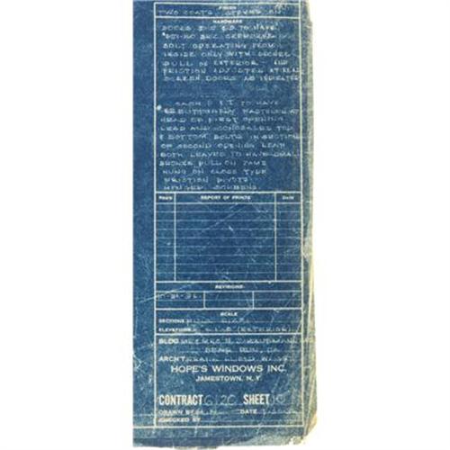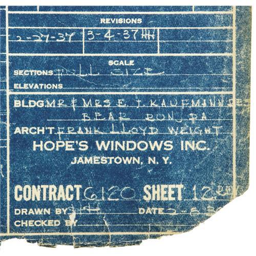 <B>Frank Lloyd Wright "Fallingwater" Blueprints.</B></I> 13 original blueprints, 32" x 23.5", np, nd. An incredible find, the original 13 blueprints for perhaps the most renowned of all American residences. Wright's concepts of architectural design were highly unorthodox. He believed the buildings should blend with their surroundings, as typified by his prairie style, so he emphasized the horizontal element and used natural colors and glass walls. He is best remembered for his Robie House, Johnson Wax Building, the Guggenheim Museum, and Fallingwater. These blueprints, to our knowledge, are the only ones in private hands. Each contractor working on the house would have had a set of blueprints. This set belonged to the window contractor. Each of the 13 large drawings bears Wright's name, that of the client, Mr. and Mrs. E.J. Kaufmann, and the home's site, Bear Run, Pa. They were discovered in Long Island by, and came from, Arthur Hennighausen, according to a letter that is included in the lot. "The shop drawings of the "Falling Water" steel sash were given to me as a professional courtesy at my architectural office in Waukegan, Illinois by J.D. Graf who at the time was sale representative for Hope Windows Inc. This was the in the spring of 1938. No record was kept to further identify the time or place". These blueprints were obviously used and show signs of wear. On the back of one is penciled "F.L. Wright" and may or may not be in the famous architect's hand. Nevertheless, the value lies in the blueprints themselves as they are stunning representations of man's ability to create something truly beautiful and still have it coexist with nature. Condition is generally good, with minor edge damage, the visual effect of which would minimized by custom framing. Several have what would appear to be tape repairs, but in fact these repairs were on the original drawings which were duplicated to form this set.