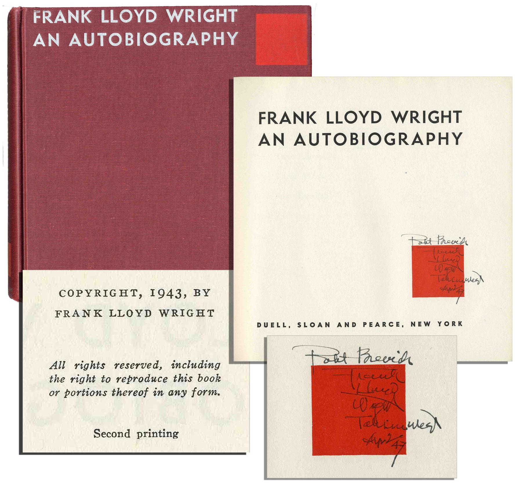Near fine copy of ''Frank Lloyd Wright: An Autobiography'' signed by the author and naturalist architect. Published by Duell, Sloan and Pearce: New York: 1943, second printing. Inscribed on the title page, ''Robert Brevick - Frank Lloyd Wright / Taliesin West / Apr 2 47''. Hardbound book measures 8.5'' x 8.5'' and runs 561 pages. With silver lettering upon rust colored boards. In near fine condition with light shelf wear. A substantial memoir that weaves Wright's personal history with his groundbreaking architectural aesthetic.