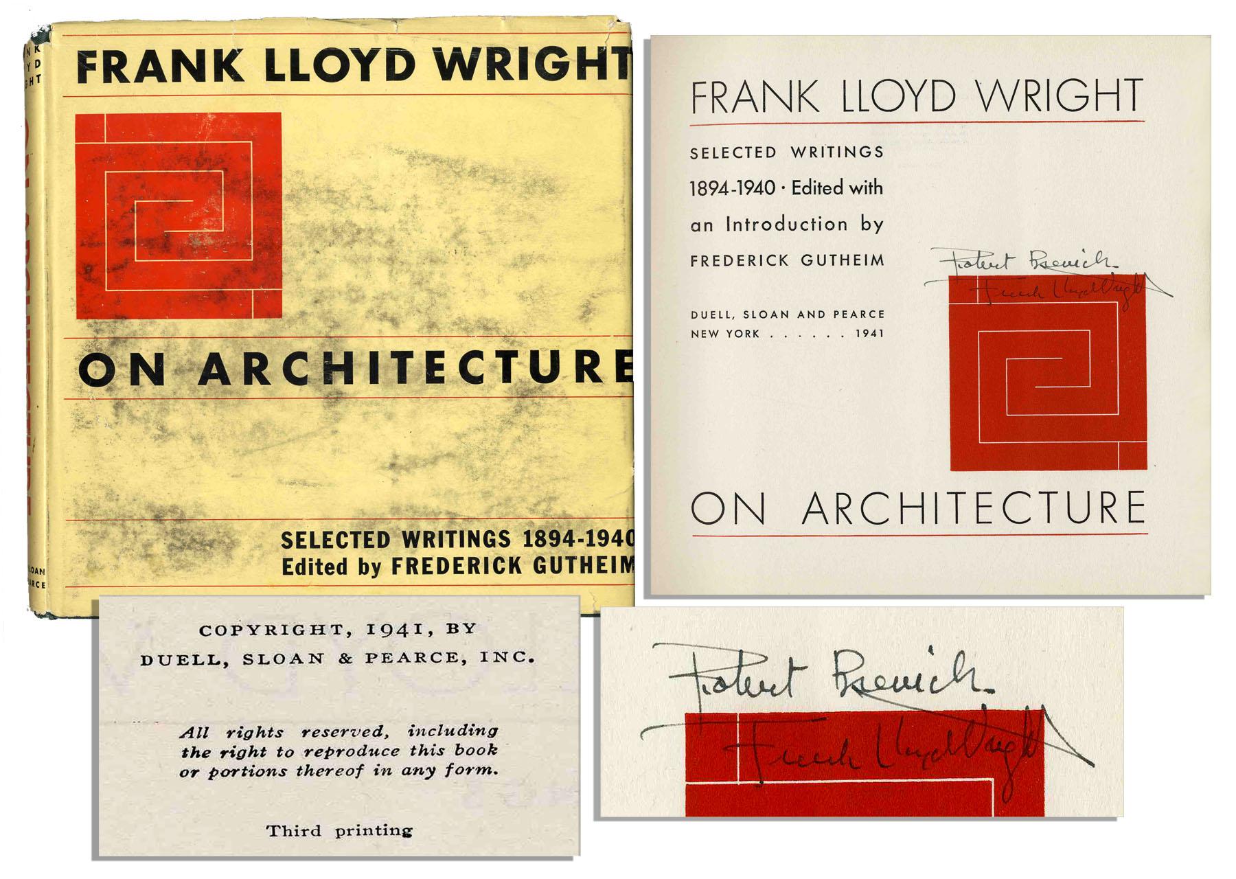 ''On Architecture: Selected Writings 1894-1940'' by Frank Lloyd Wright, signed and inscribed by the architect on the title page, ''Robert Brevick / Frank Lloyd Wright''. Duell, Sloan and Pearce: New York: 1941, edited by Frederick Gutheim. An interesting compendium by Wright on architecture, from his earliest 19th century writings to his Taliesin masterpiece and thoughts on an architect's contribution to culture. 275pp. hardbound book measuring 8.75 square inches is in near fine condition. With dustjacket in fair to good condition.