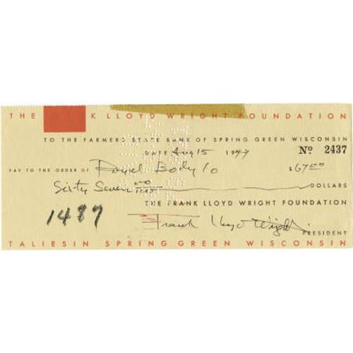 <B>Frank Lloyd Wright Signed Check,</B></I> one page, Spring Green, Wisconsin, August 15, 1947. This check was designed by Wright for the Frank Lloyd Wright Foundation's Taliesin School. Perforated cancel with some old tape along top edge. Fine condition with a large, bold signature.<BR><BR><b>Shipping:</b> Flat Material, Small (<a target="_blank" href="http://www.heritageauctions.com/common/shipping.php">view shipping information</a>)