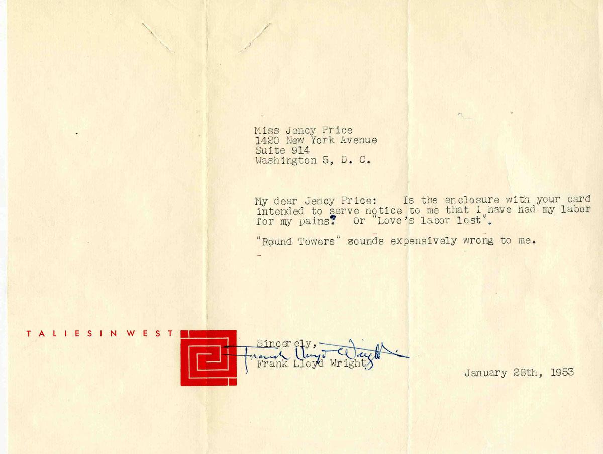 Frank Lloyd Wright typed letter signed on ''Taliesin West'' stationery, Wright's beloved winter home in Scottsdale, Arizona. Dated 28 January 1953, Wright's letter reads in full: ''My dear Jency Price: is the enclosure with your card intended to serve notice to me that I have had my labor for my pains? Or 'Love's labor lost'. 'Round Towers' sounds expensively wrong to me…'' With a distinctive and bold ''Frank Lloyd Wright'' signature. Letter, measuring 11'' x 8.5'' on one page, has two vertical folds and staple marks on upper left corner. Includes original envelope with ''Taliesin'' logo. Both letter and envelope have slight toning throughout, else near fine condition.