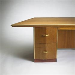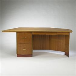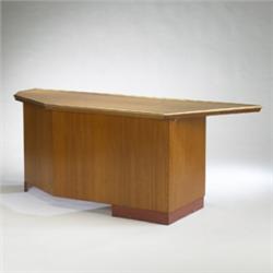 Frank Lloyd Wright desk for The Price Tower, Bartlesville, Oklahoma USA, 1952 mahogany, brass, copper 72"w x 26"d x 28"h Frank Lloyd Wright called Price Tower "the tree that escaped the crowded forest." Commissioned by Harold C. Price, founder of H.C. Price Company, Price Tower was completed in 1956. The nineteen-story building was based on a design originally conceived for St. Mark's in New York City and is Wright's tallest building. Wright had a distain for perpendicular lines in his designs, and the desk exhibits the angularity that is repeated throughout the floor plan and exterior of the Tower. A rarity at auction, this desk is one of only a handful removed from the building.