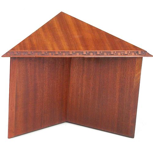 Frank Lloyd Wright table, manufactured by Heritage Henredon, triangular form with Taliesin design at edge on a tri-slab base, signed with red monogram,19in.w x 19in.d x 15in.h,very good condition