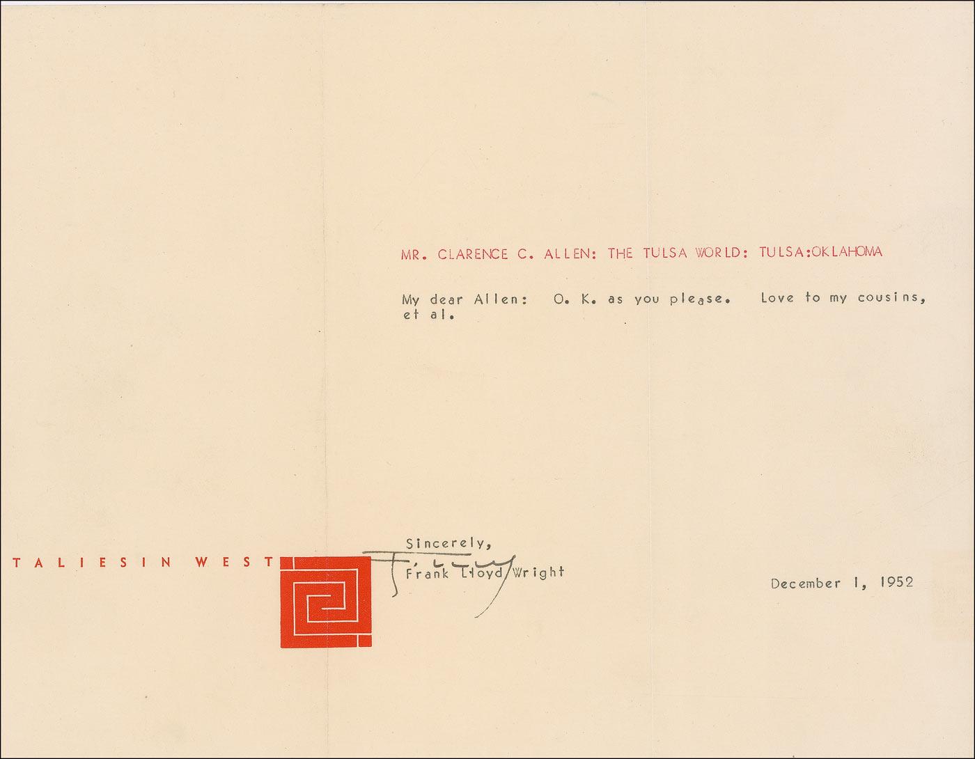 Highly influential American architect (1867–1959) whose mastery of space, form, and human-centered design revolutionized the field of architecture and earned him a place among the greatest thinkers and artists of the twentieth century. TLS signed “F. L. L. W.,” one page, 11 x 8.5, Taliesin West letterhead, December 1, 1952. Short letter to Clarence C. Allen at the Tulsa World. In full, “O. K. as you please. Love to my cousins et al.” Nicely signed at the conclusion in black ink by Wright. In fine condition, with two vertical mailing folds. Accompanied by the original mailing envelope.