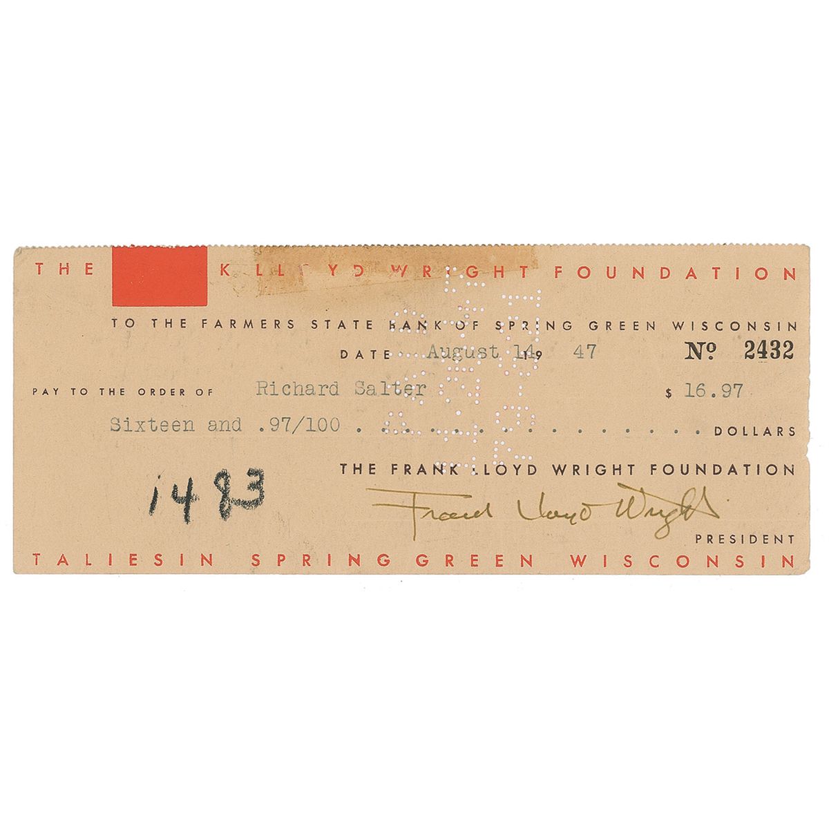 Wright-designed business check for the Frank Lloyd Wright Foundation, 8 x 3.25, filled out in type and signed by Wright, payable to Richard Salter for $16.97, August 14, 1947. In very good condition, with central vertical fold affecting first letter of signature, cancellation holes to body, and toning and slight paper loss to top edge from old tape.
