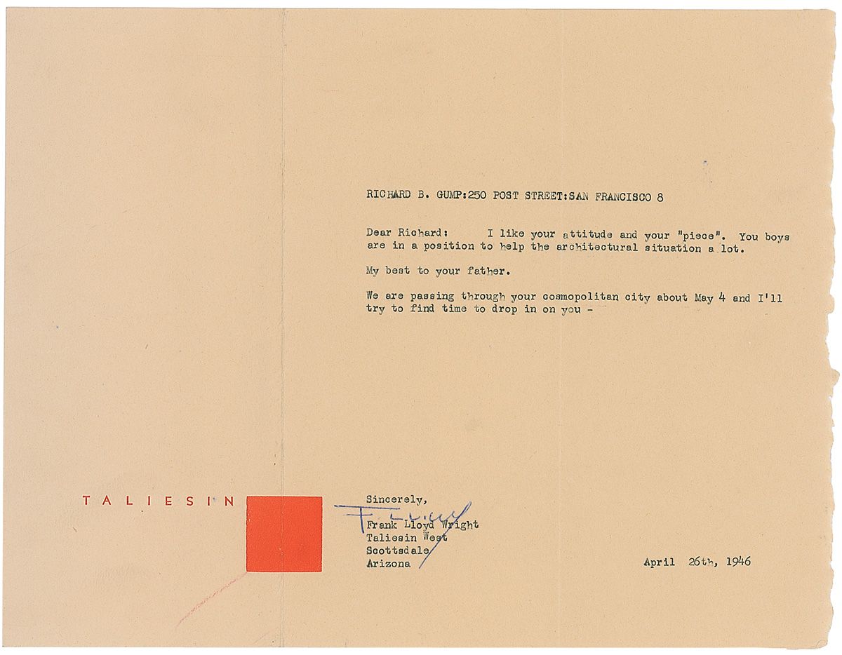 TLS signed “F. Ll. Wright,” one page, 10.75 x 8.5, Taliesin letterhead, April 26, 1946. Letter to Richard B. Gump in San Francisco. In full: “I like your attitude and your ‘piece’. You boys are in a position to help the architectural situation a lot. My best to your father. We are passing through your cosmopolitan city about May 4 and I’ll try to find time to drop in on you.” In fine condition, with two vertical folds and a light red pencil mark to lower left. As a Gump’s customer, Frank Lloyd Wright amassed a vast collection of Asian art and, today, still in existence, Gump’s offers sculptures which re-create the foo dogs that stood guard at the entry to Taliesin, Wright’s winter residence in Arizona.