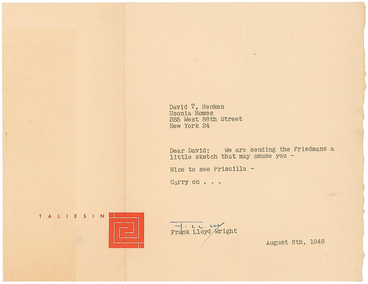 TLS signed “F. Ll. W.,” one page, 11 x 8.25, Taliesin letterhead, August 6, 1948. Brief letter to David Henken of Usonia Homes. In full: “We are sending the Friedmans a little sketch that may amuse you—Nice to see Priscilla—Carry on.” In fine condition, with several vertical folds and a bit of scattered light soiling. The Sol Friedman House, referred to as Toyhill, was built in Pleasantville, New York in 1948. It was the first of the three Wright homes built in the Usonia Homes development north of New York City.