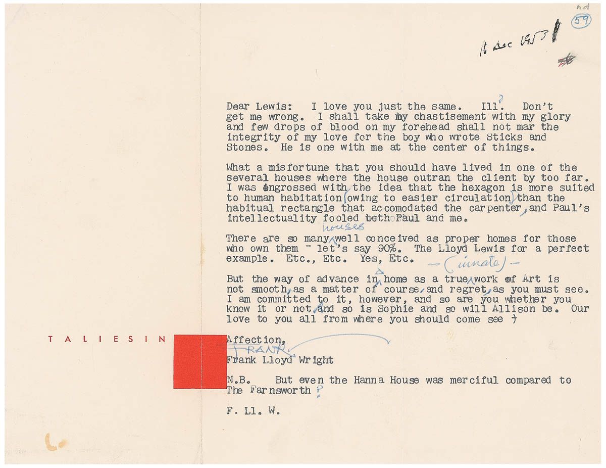 TLS signed “Frank,” one page, 7.25 x 8.5, Taliesin stationery, dated by recipient in the upper left, December 16, 1953. Letter to Lewis Mumford. In full: “I love you just the same. Ill? Don’t get me wrong. I shall take my chastisement with my glory and few drops of blood on my forehead shall not mar the integrity of my love for the boy who wrote Sticks and Stones. He is one with me at the center of things. What a misfortune that you should have lived in one of the several houses where the house outran the client by too far. I was engrossed with the idea that the hexagon is more suited to human habitation (owing to easier circulation) than the habitual rectangle that accommodated the carpenter, and Paul’s intellectuality fooled both Paul and me. There are so many houses well conceived as proper homes for those who own them—let’s say 90%. The Lloyd Lewis for a perfect example. Etc., Etc. Yes. Etc. But the way of advance in a home as a true (innate) work of Art is not smooth, as a matter of course, and regret, as you must see. I am committed to it, however, and so are you whether you know it or not and so is Sophie and so will Allison be. Our love to you all from where you should come see. N.B. But even the Hanna House was merciful compared to The Farnsworth?” Wright hand-corrected a few words, and added a large portion of the punctuation in blue ink. A central vertical fold, spot of soiling to the left border, and original ink and pencil notations, otherwise fine condition.