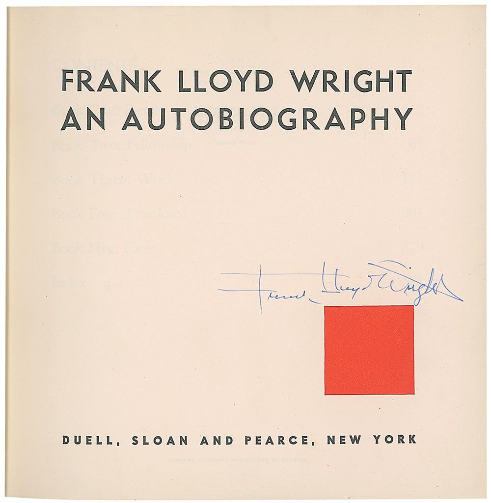 Signed book: An Autobiography. Later printing. NY: Duell, Sloan and Pearce, 1943. Hardcover, 8.5 x 8.5, 560 pages. Signed on the title page in blue ink. Autographic condition: fine. Book condition: VG+/None. Red cloth-covered boards; minor rubbing along edges; textblock edges and feps lightly foxed and soiled; previous owner’s name in pen on rear pastedown.
