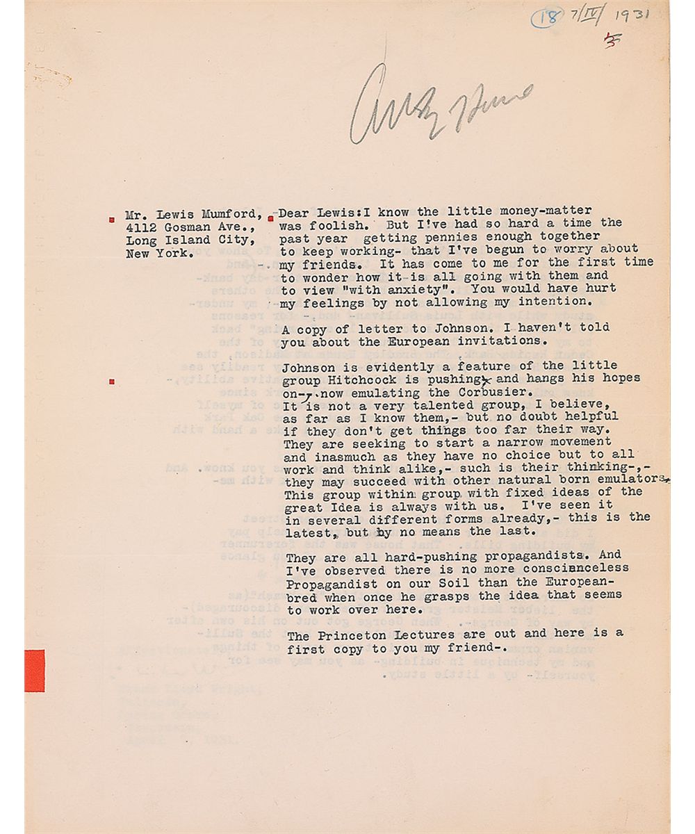 TLS signed “F. LL. W.,” three pages on two adjoining sheets, 8.5 x 11, Frank Lloyd Wright Incorporated letterhead, April 7, 1931. Letter to Lewis Mumford. In full: “I know the little money-matter was foolish. But I’ve had so hard a time the past year getting pennies enough together to keep working—that I’ve begun to worry about my friends. It has come to me for the first time to wonder how it is all going with them and to view ‘with anxiety’. You would have hurt my feelings by not allowing my intention.