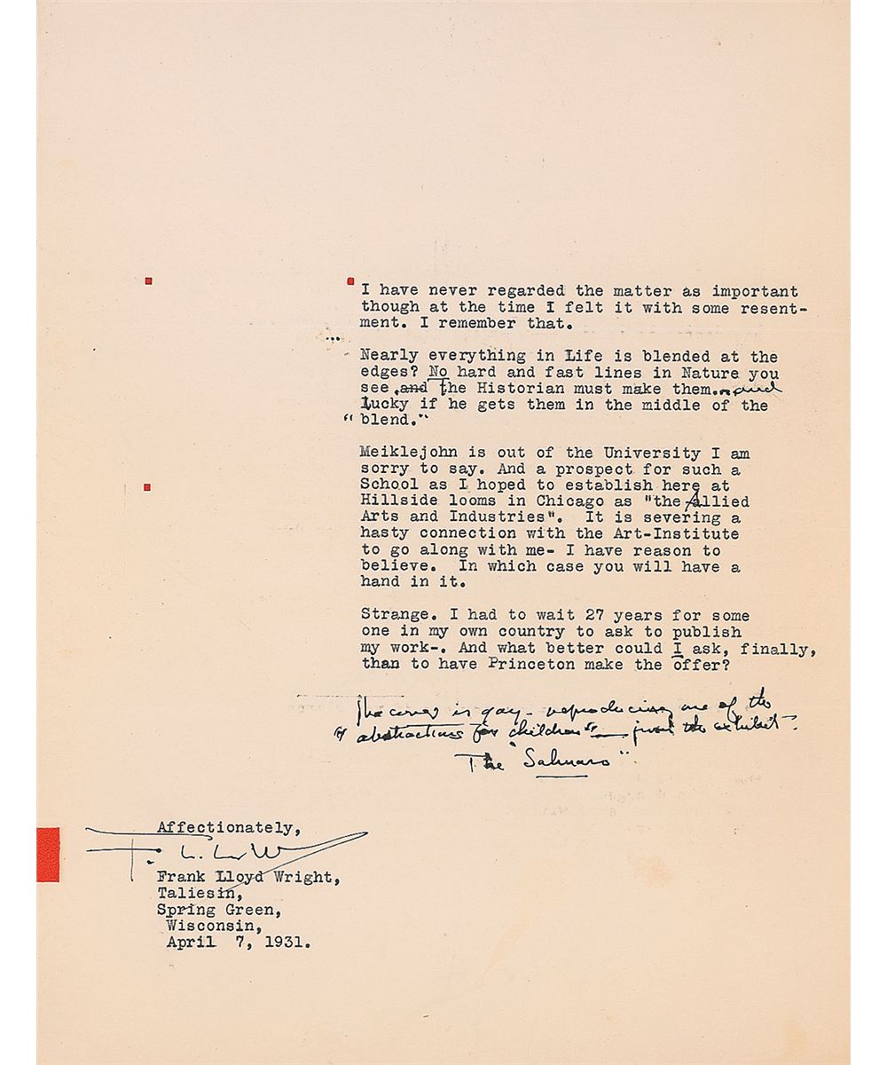 Strange. I had to wait 27 years for some one in my own country to ask to publish my work-. And what better could I ask, finally, than to have Princeton make the offer?” Wright hand writes a few corrections throughout the text, as well as a brief postscript: “The cover is gay—reproducing one of the ‘abstractions for children’—from the exhibit? The ‘Sahuaro.’ In fine condition, with pencil notations to top.