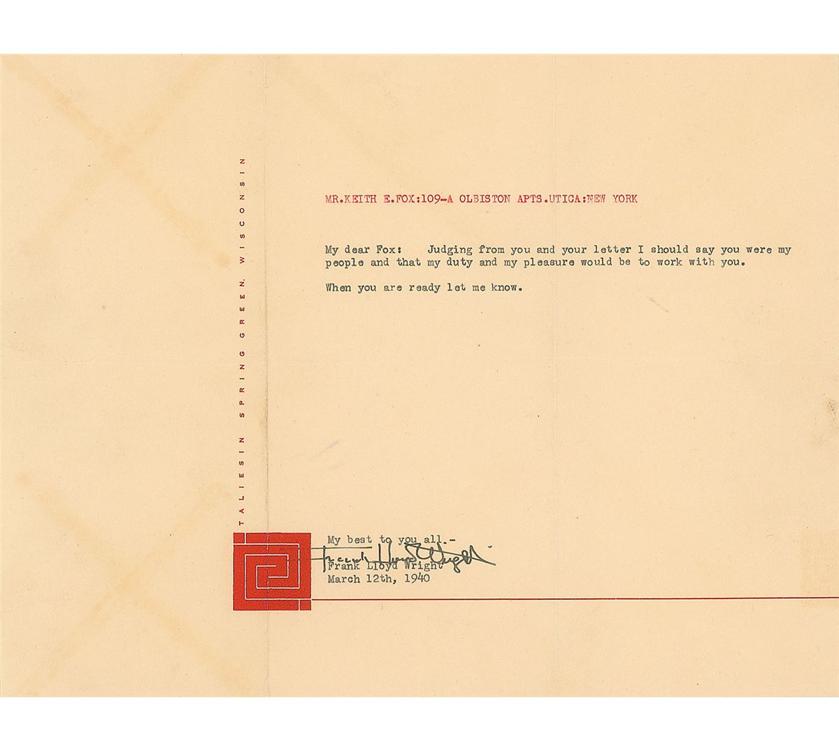 TLS, one page, 11 x 8.5, Taliesin letterhead, March 12, 1940. Short letter to Keith Fox. In full: “Judging from you and your letter I should say you were my people and that my duty and my pleasure would be to work with you.” In fine condition, with intersecting folds, and two light areas of toning to left blank border. Accompanied by the original mailing envelope.