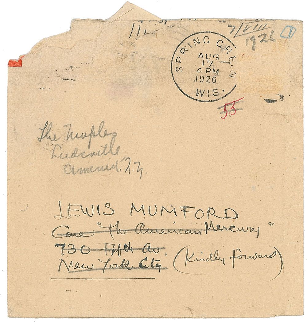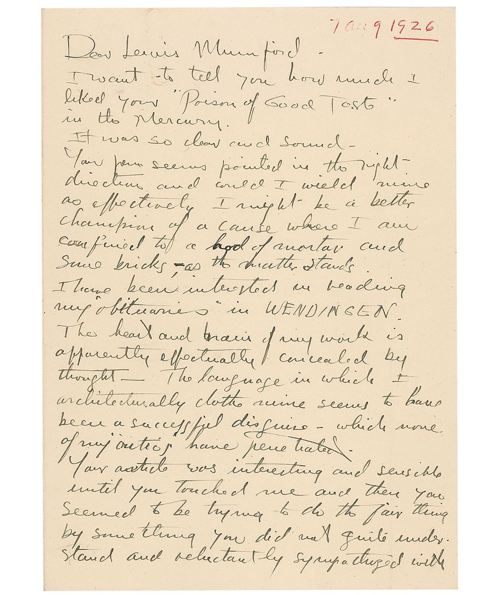 ALS, two pages on two adjoining sheets, 5.5 x 7.5, August 7, 1926. Letter to Lewis Mumford. In full: “I want to tell you how much I liked your ‘Poison of Good Taste’ in the Mercury. It was so clear and sound. Your pen seems pointed in the right direction and could I wield mine as effectively I might be a better champion of a cause where I am confined to a hod of mortar and some bricks—as the matter stands.