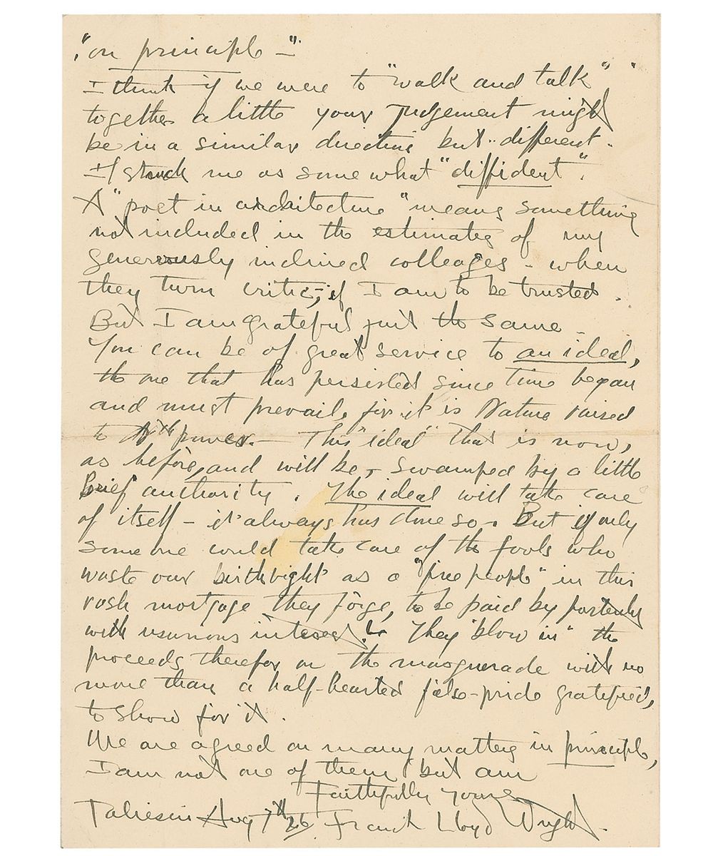 In the early 1920s, with his individualistic and organic approach to design and his near-absence from the architectural hub of New York City, Frank Lloyd Wright was largely ignored by peers and critics alike. An important exception was the up-and-coming critic Lewis Mumford, who in his controversial 1924 book Sticks and Stones, offered a harsh critique of American architecture, with a brief positive mention of Wright. The following year, Mumford contributed an essay to a special issue of the Dutch journal Wendingen dedicated to Wright (referred to in this letter as his “obituaries”); and finally, in 1926, sparked this initial correspondence with his article ‘The Poison of Good Taste’ in The American Mercury. While questioning the depths of Mumford’s understanding in his typical condescending tone—“Your article was interesting and sensible until you touched me and then you seemed to be trying to do the fair thing by something you did not quite understand”—Wright does offer several complimentary and inviting lines, beginning a friendship that would span a lifetime. The incredible first letter from the now-famous correspondence of two pivotal figures in 20th century American architecture and urbanism.