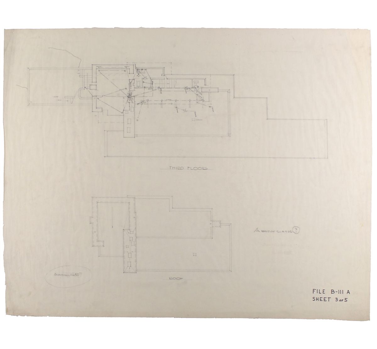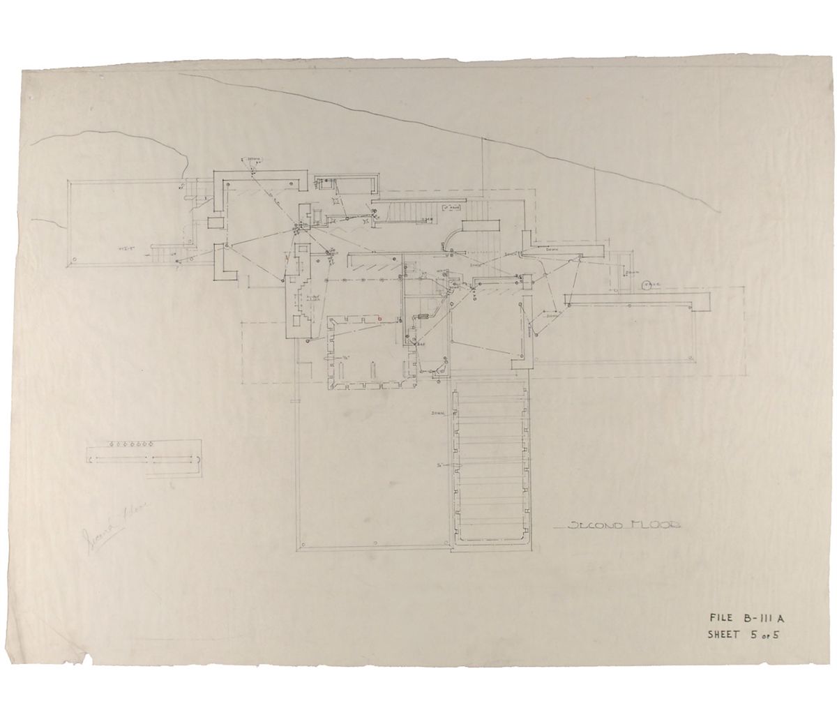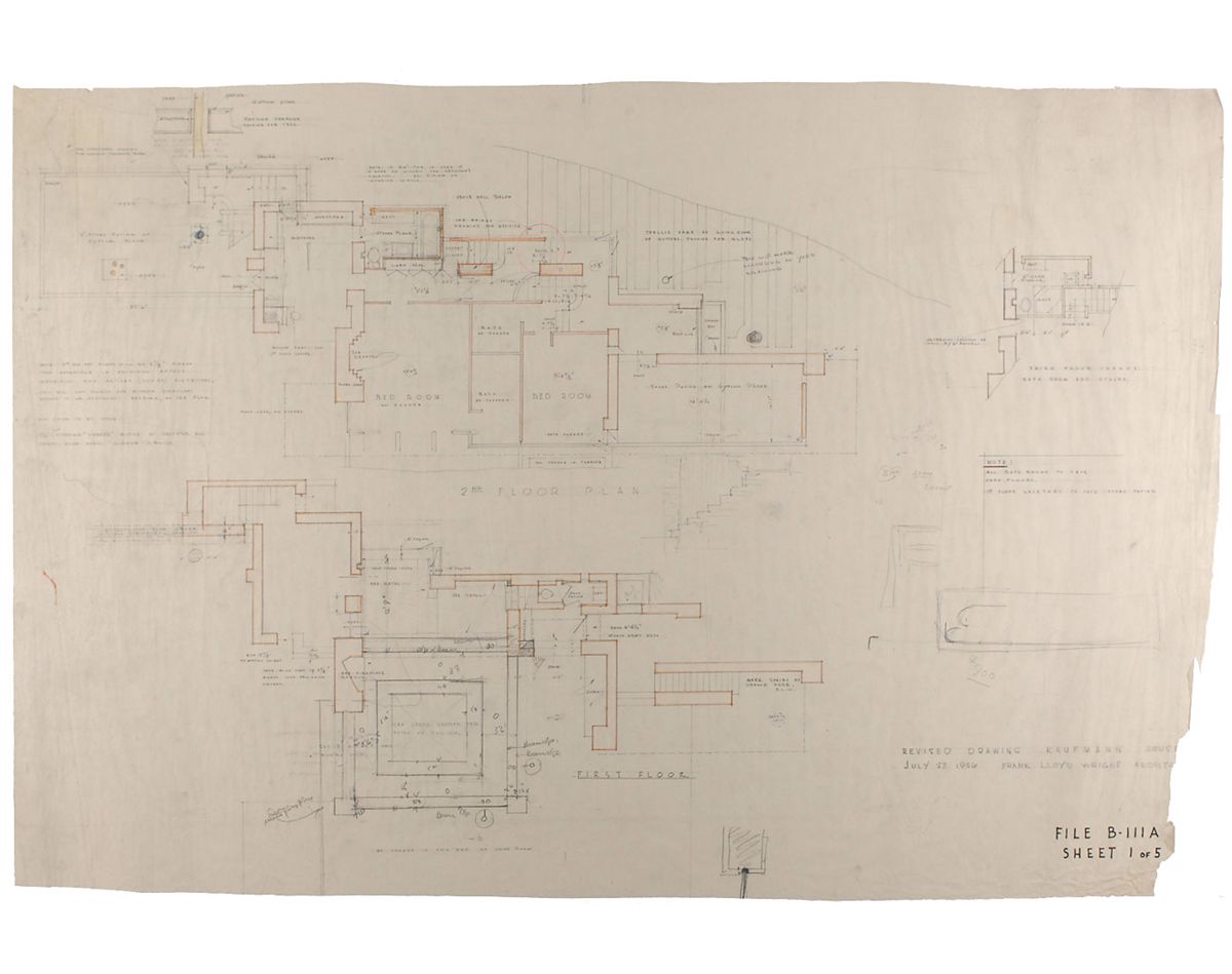 Incredibly rare set of five original pencil and colored pencil developmental architectural drawings of Wright’s Fallingwater masterpiece, on large onionskin pages, each approximately 40 x 28, all done in an unknown hand, with the first page titled in pencil, “Revised Drawing Kaufmann House, July 27, 1936, Frank Lloyd Wright Architect,” also in an unknown hand. Each page is also notated “File B-111A,” and numbered one through five. Page one shows a remarkably detailed overhead view of the first and second floor plans of the home, all labeled with accurate measurements, with notes on the side indicating, “All bath rooms to have cork floors,” and “1st floor lavatory to have stone paving.” Several additional pencil sketches have been added to the first page as well, including a window, and staircase, again in an unknown hand, as well as several notations to individual areas of the drawing.