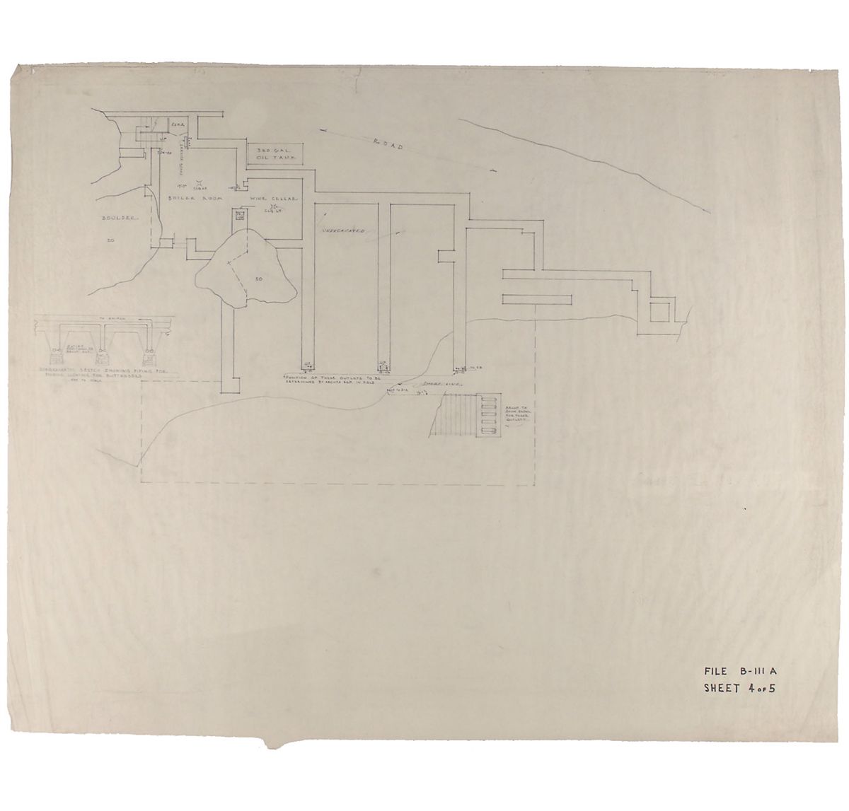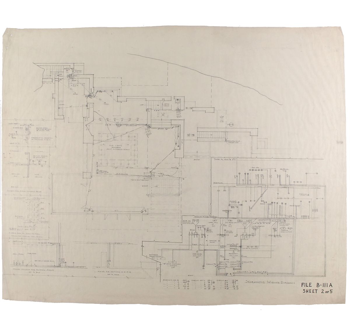 Second page is a detailed wiring schematic of the entire home, listing 15 different circuits. Third page shows an overhead view of roof and third floor, with the fourth page showing details of the basement, complete with boulders, a wine cellar and boiler room, with the shore line of Bear Run added to the bottom portion of the drawing, and the final page shows an overhead view of the second floor. Rolled and in overall fine condition, with some paper loss to lower right corner of first page, expected handling wear and soiling, and some scattered light creases.