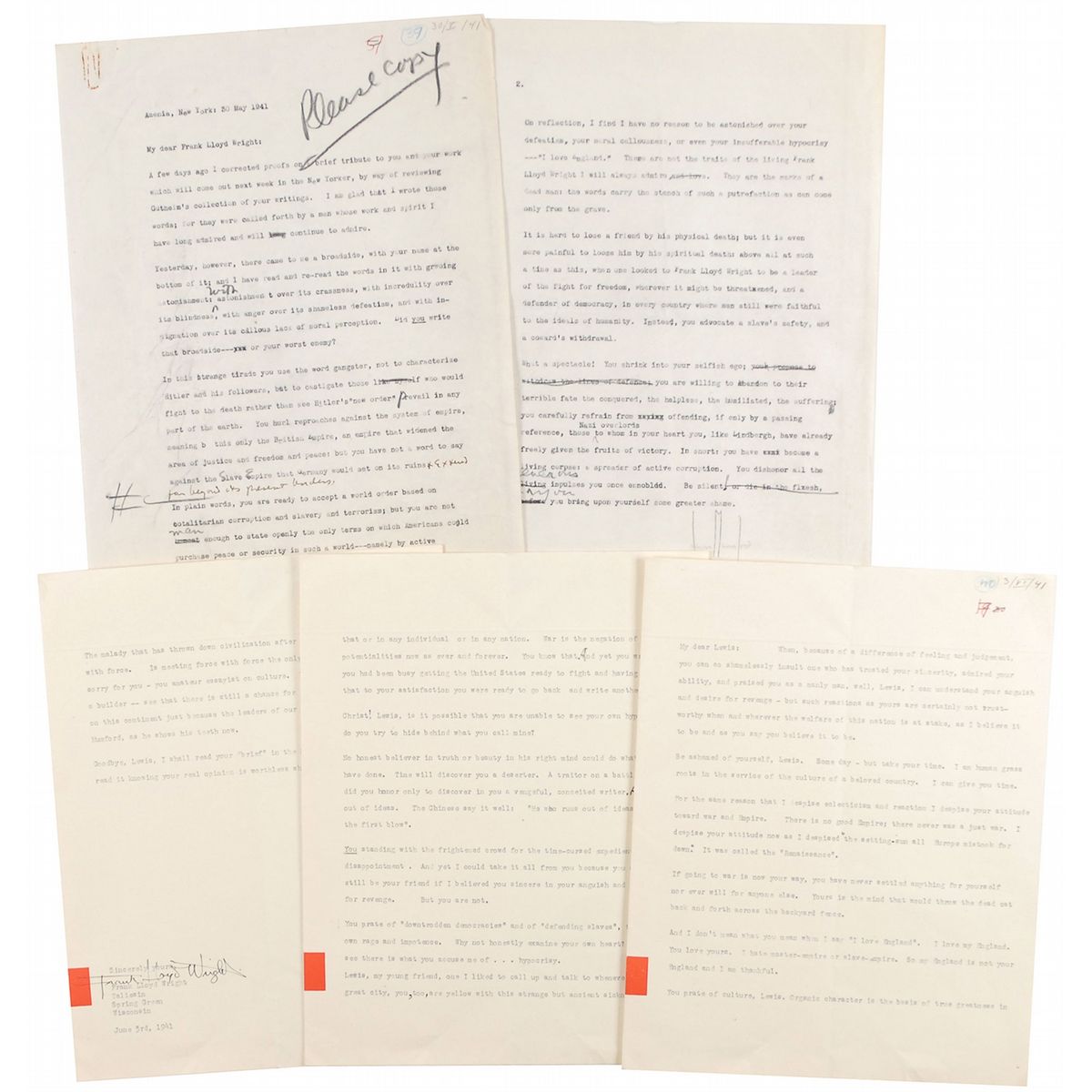 TLS, three pages, 8 x 10, on Wright’s red-block paper, June 3, 1941. Letter to Lewis Mumford. In full: “When, because of a difference of feeling and judgement, you can so shamelessly insult one who has trusted your sincerity, admired your ability, and praised you as a manly man, well, Lewis, I can understand your anguish and desire for revenge—but such reactions as yours are certainly not trustworthy when and wherever the welfare of this nation is at stake, as I believe it to be and as you say you believe it to be.