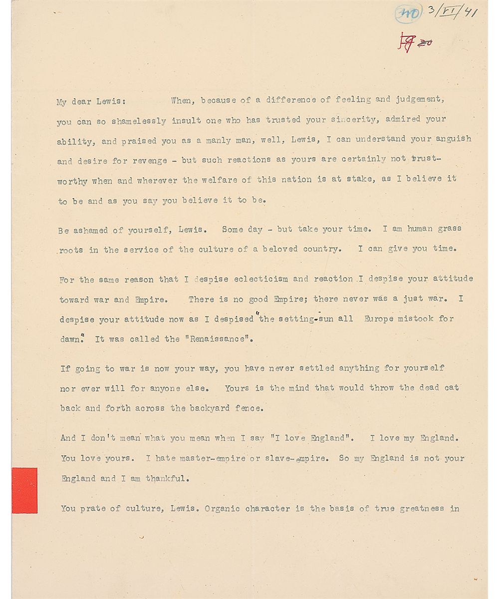 Be ashamed of yourself, Lewis. Some day—but take your time. I am human grass roots in the service of the culture of a beloved country. I can give you time. For the same reason that I despise eclecticism and reaction I despise your attitude toward war and Empire. There is no good Empire; there never was a just war. I despise your attitude now as I despised ‘the setting sun all Europe mistook for dawn.’ It was called the ‘Renaissance’. If going to war is now your way, you have never settled anything for yourself nor ever will for anyone else. Yours is the mind that would throw the dead cat back and forth across the backyard fence. And I don’t mean what you mean when I say ‘I love England.’ I love my England. You love yours. I hate master-empire or slave-empire. So my England is not your England and I am thankful.