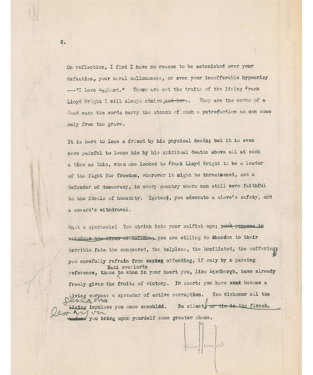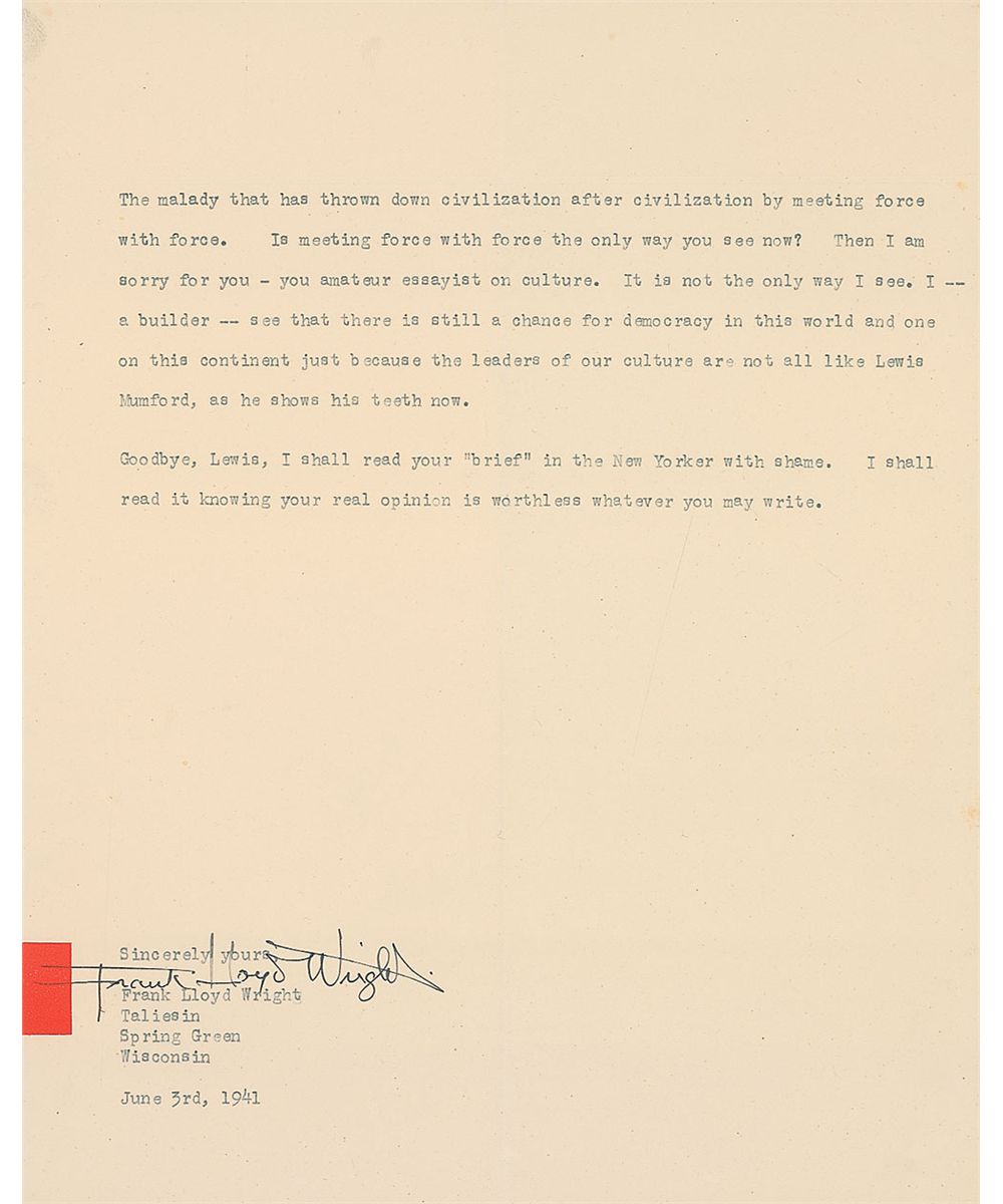 Goodbye, Lewis, I shall read your ‘brief’ in the New Yorker with shame. I shall read it knowing your real opinion is worthless whatever you may write.” Wright added a few punctuation and capitalization corrections throughout the text in his own hand. In fine condition, with intersecting folds and a few unobtrusive creases. Accompanied by Mumford’s retained carbon copy of the equally intense letter to Wright that prompted this response. Published in Frank Lloyd Wright & Lewis Mumford: Thirty Years of Correspondence, Princeton Architectural Press, 2001.