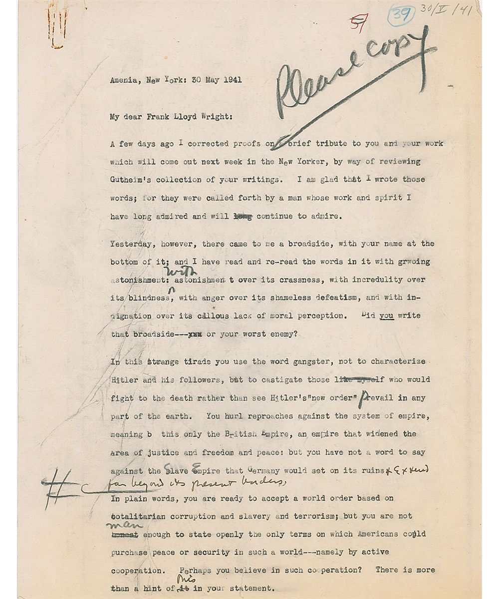 Throughout the 1930s, as he watched the Nazi party grow, Lewis Mumford took a strong interventionist stand, writing numerous articles and two books in support of US involvement. Wright took the opposite stance, putting a serious strain on their friendship, which would finally come to a head in 1941; when Mumford received a copy of Wright’s broadside that proclaimed, ‘…Our frontier is no longer England nor, in any sense, is it European. Our frontier is our own shores,’ he could no longer overlook the difference. Infuriated, he wrote to Wright to express the anguish and deep disappointment he now felt towards the man he had admired for so long: “It is hard to lose a friend by his physical death; but it is even more painful to loose him by his spiritual death… You dishonor all the generous impulses you once ennobled. Be silent lest you bring upon yourself some greater shame.” Never one to back down, Wright replied with this equally excoriating letter, attacking not only Mumford’s political view, but his personal character and professional legitimacy as well: “You prate of ‘downtrodden democracies’ and of ‘defending slaves’, to justify your own rage and impotence… Is meeting force with force the only way you see now? Then I am sorry for you—you amateur essayist on culture.” Offered here with the corrected carbon of Mumford’s letter that sparked this brutal reply, this long goodbye holds the intensity that the world has come to expect from the writings of Frank Lloyd Wright. Beginning a ten-year gap in their exchange, and leaving their friendship forever scarred, this is a remarkable and important letter from the well-known correspondence between the architect and his one-time friend and critic.