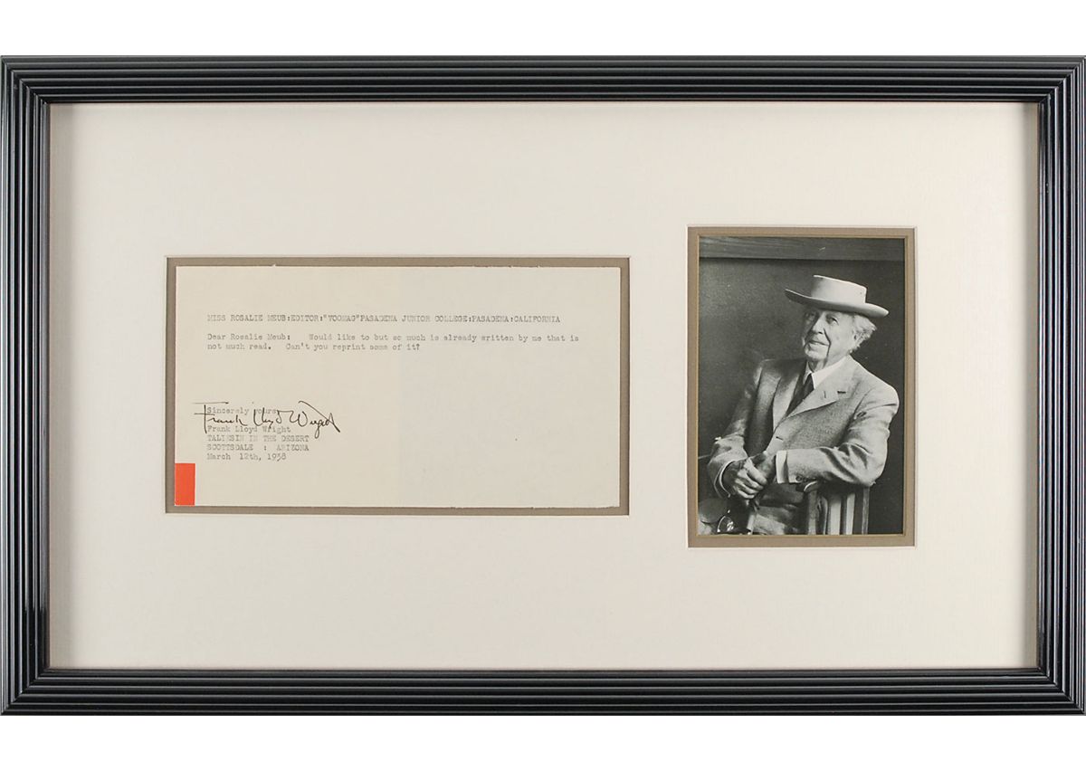 TLS, one page, 8 x 4.25, on Wright’s red-block paper, March 12, 1938. Letter to “Miss Rosalie Meub: Editor: ‘Voomag’ Pasadena Junior College: Pasadena: California.” In full: “Would like to but so much is already written by me that is not much read. Can't you reprint some of it?” Nicely double-matted and framed with a photo of Wright to an overall size of 19.5 x 12. In fine condition. Accompanied by the original mailing envelope.