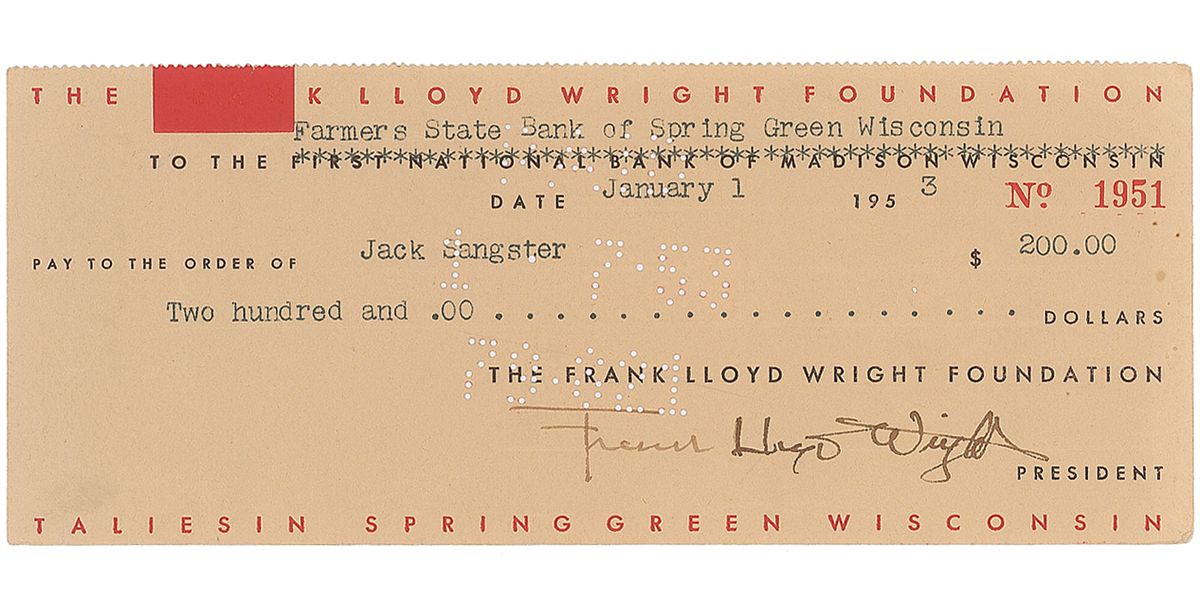 Appealing Wright-designed business check for the Frank Lloyd Wright Foundation, 8.25 x 3.25, filled out in type and signed by Wright, payable to Jack Sangster for $200.00, January 1, 1953. In fine condition, with cancellation holes to body just touching the top of first letter of signature.