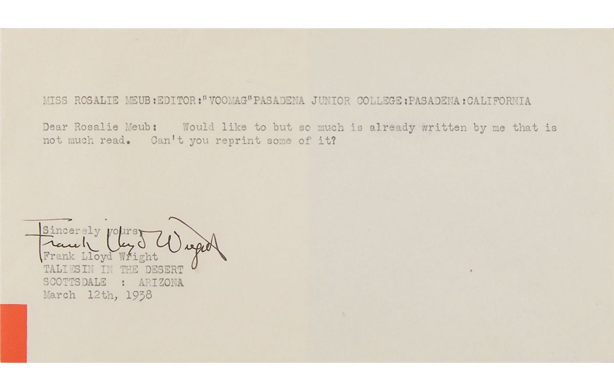 TLS, one page, 8 x 4.25, on Wright’s red-block paper, March 12, 1938. Letter to “Miss Rosalie Meub: Editor: ‘Voomag’ Pasadena Junior College: Pasadena: California.” In full: “Would like to but so much is already written by me that is not much read. Can't you reprint some of it?” Nicely double-matted and framed with a photo of Wright to an overall size of 19.5 x 12. In fine condition. Accompanied by the original mailing envelope.