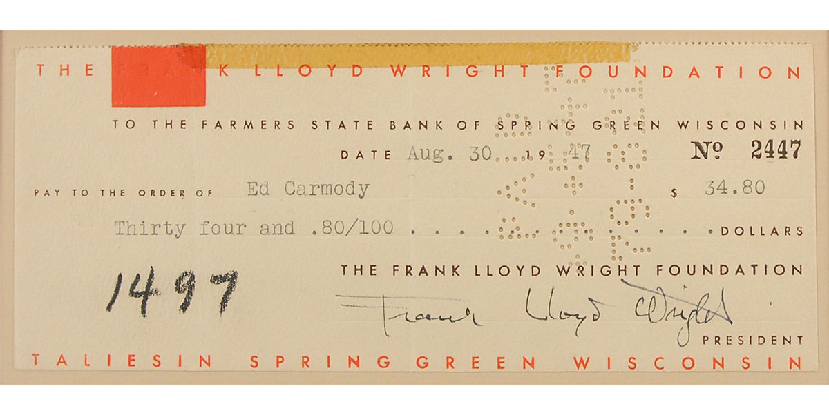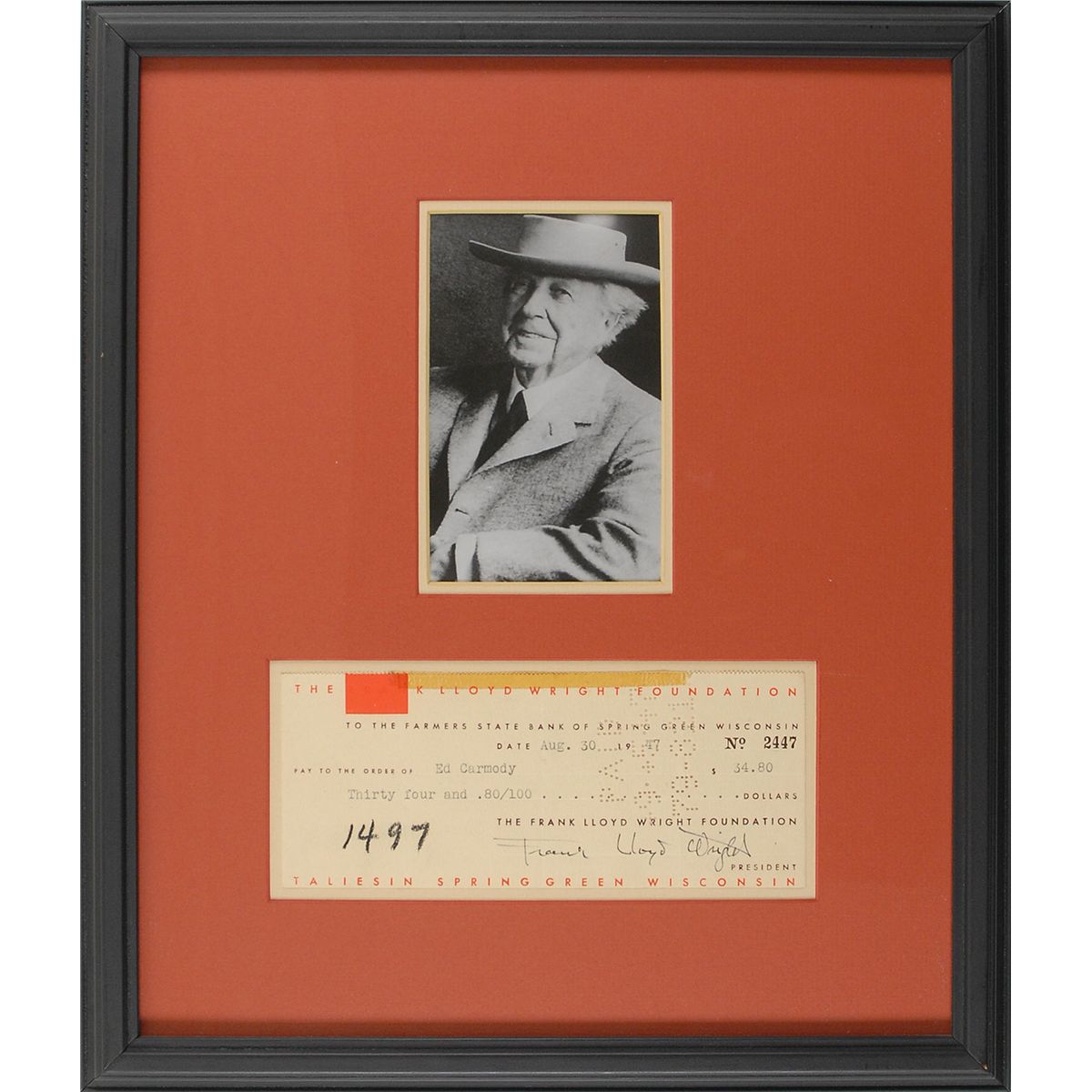 Well-designed Frank Lloyd Wright Foundation business check, 8 x 3.25, filled out in type and signed by Wright, payable to Ed Carmody for $34.80, August 30, 1947. Double-matted and framed with a portrait of the architect to an overall size of 15 x 17.5. Three trivial vertical folds (two passing through letters of the signature), expected cancellation holes and bank notations, and a toned strip of tape to the top edge, otherwise fine condition. Carmody was a workman at Taliesin in Wisconsin.