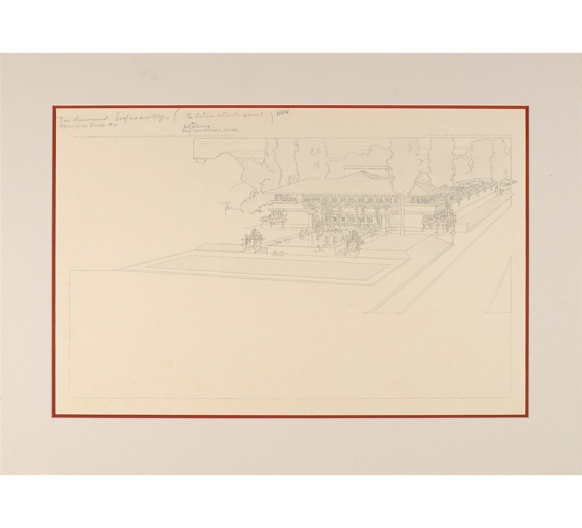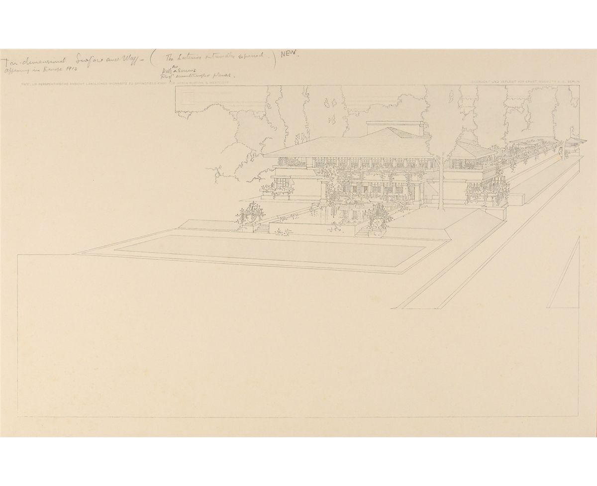 Exceptional German lithograph, 23 x 14, titled in German [translated here], ‘Perspective View of House in its Landscape in Springfield, Ohio, for Burton,’ with Wright’s handwritten pencil notations at the top, “Tri-dimensional Surface and Wall—(The Interior outwardly expressed) NEW. Walls are screens, roof uninterrupted planes. Offering in Europe 1910.” Double-matted to an overall size of 28.5 x 21. In fine condition, with subtle scattered foxing. The house depicted is the Burton Westcott House, built in 1904–05 and considered a significant example of Wright’s ‘Prairie Style’ houses. With Wright’s abstruse commentary at the top, he notes that the diagram is “tri-dimensional,” that is, shown in plan, section, and elevation, and that the “interior is outwardly expressed,” meaning that the interior function can be inferred by exterior design. Wright’s architecture grew popular in Germany, and the publisher Ernst Wasmuth released a two-volume lithograph portfolio of his designs—the first publication of Wright’s work anywhere in the world. This example comes from the Wasmuth portfolio that Wright annotated and gave to his longtime friend (and sometimes enemy) critic Lewis Mumford, who was noted for his study of cities and urban architecture.