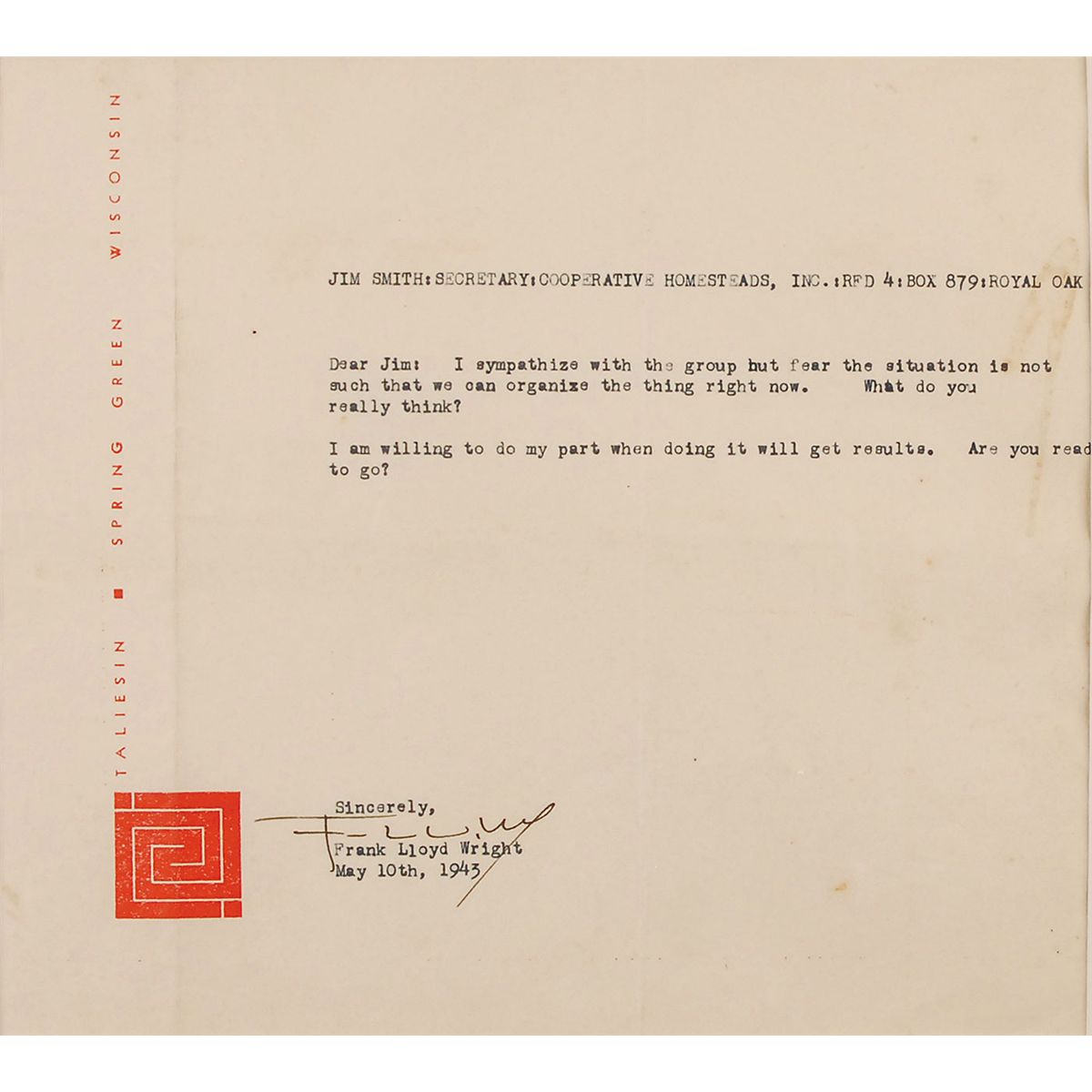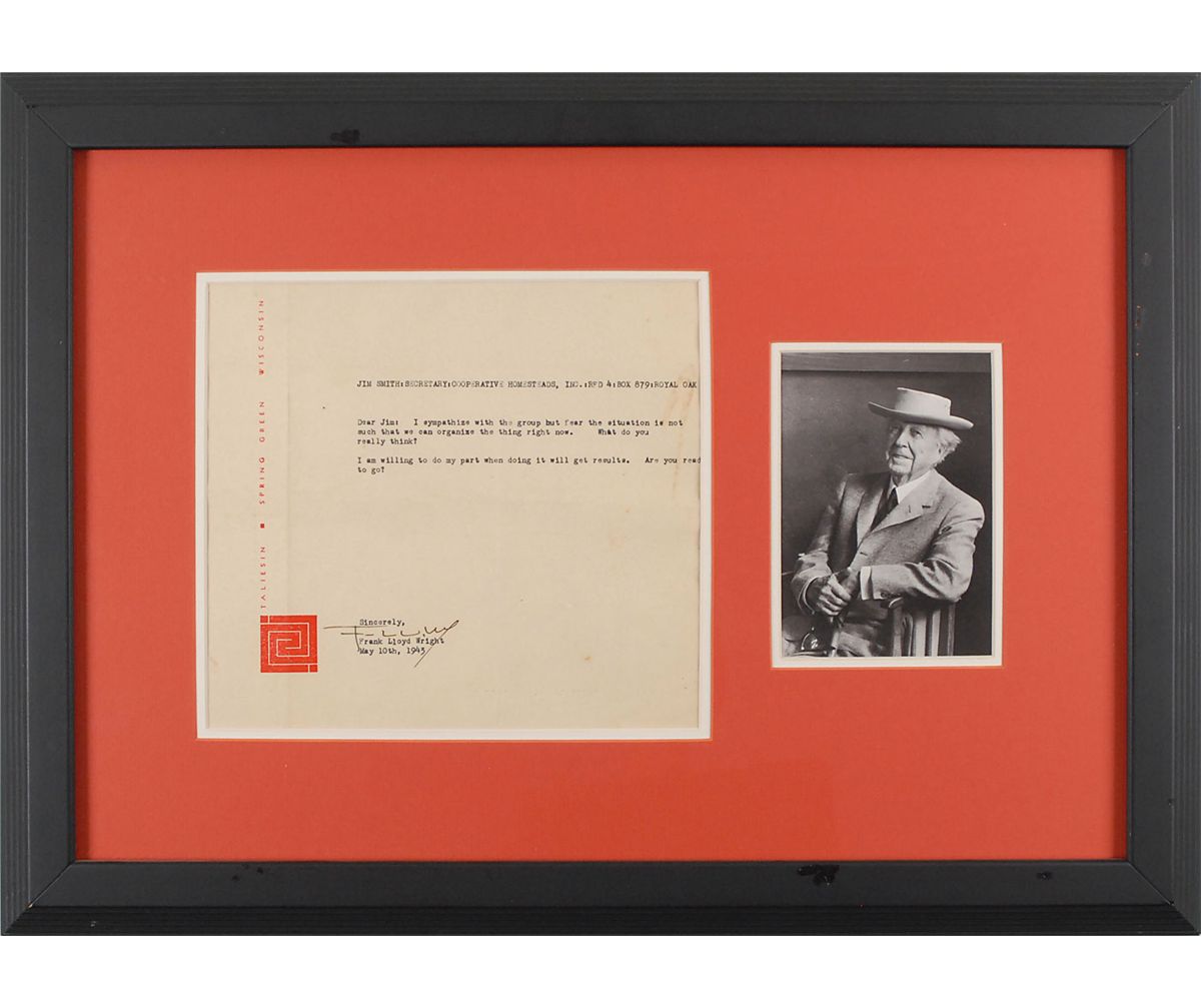 Interesting TLS, 8.75 x 7.75, Taliesin letterhead, May 10, 1943. Letter to Jim Smith, secretary of Cooperative Homesteads, Inc., in full: “I sympathize with the group but fear the situation is not such that we can organize the thing right now. What do you really think? I am willing to do my part when doing it will get results. Are you ready to go?” Double-matted and framed with a handsome portrait of the esteemed architect to an overall size of 21.5 x 15.5. In fine condition, with two vertical folds and a few scattered stains, mostly to right side. In 1941 Frank Lloyd Wright began the Cooperative Homesteads community project in Detroit’s Madison Heights. Embodying his ideas of decentralization, modern-cost housing, and living in a more natural landscape, the project was unfortunately shelved due to the Second World War.